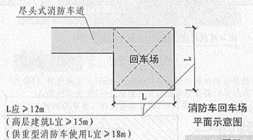 3.1尽头式消防车道应设置回车道或回车场,回车场的面积不应小于12mX12m;对于高层建筑,不宜小于15mX15m;供重型消防车使用时,不宜小于18mX18m。