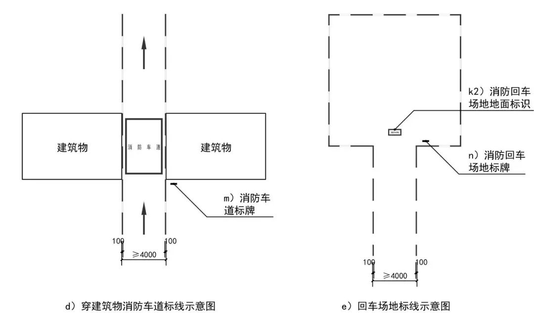 4.8在消防车通道两侧设置醒目的警示牌,提示严禁占用消防车道,违者将承担相应法律责任等内容。做法参见【详图)m)】消防通道标牌应设于穿过建筑物的消防通道洞口上方、右侧。