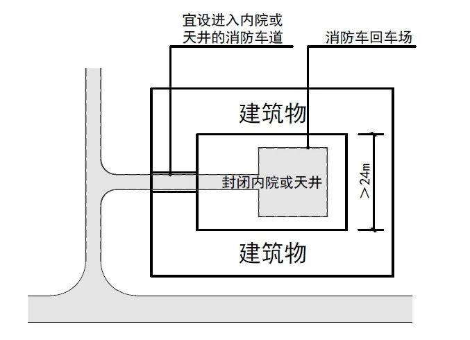 3.2有封闭内院或天井的建筑物,当内院或天井的短边长度大于24m时,宜设置进入内院或天井的消防车道。