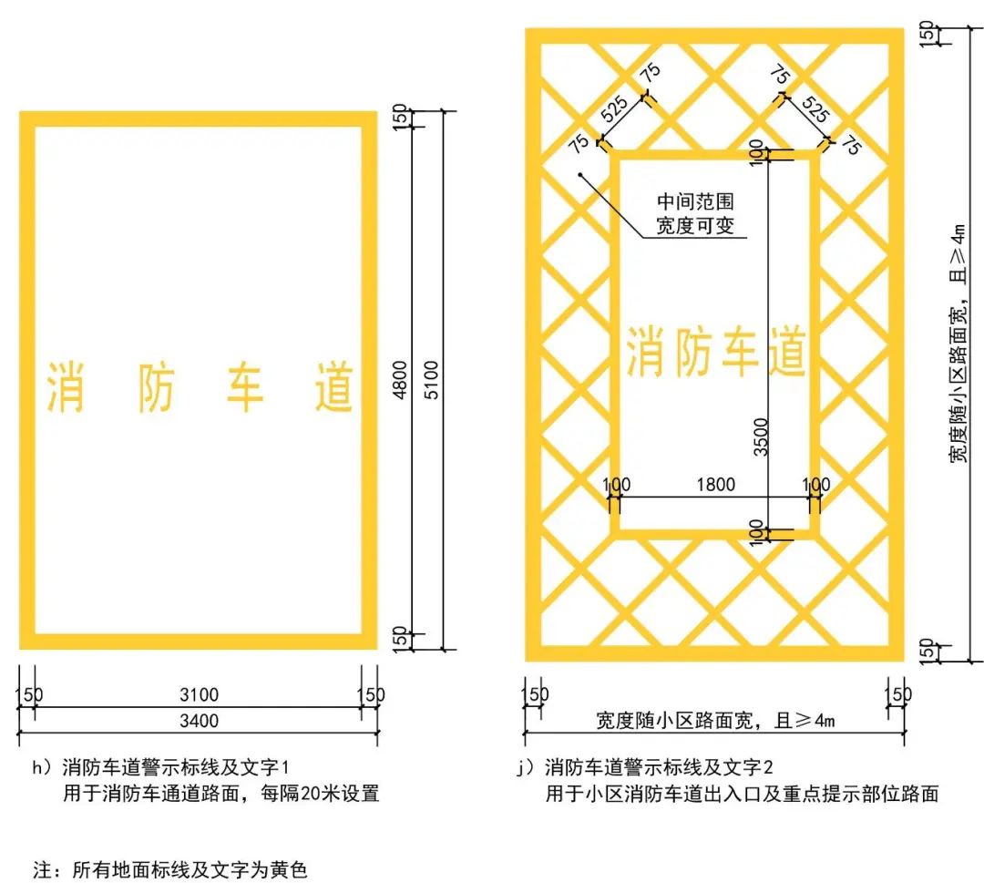 4.4在单位或者住宅区的消防车通道出入口路面,按照消防车通道净宽施划禁停标线【图示1.2】,标线为黄色网状实线,外边框线宽20厘米,内部网格线宽10厘米,内部网格线与外边框夹角45度,标线中央位置沿行车方向标注内容为“消防车道”的警示字样。做法参见【详图j)】