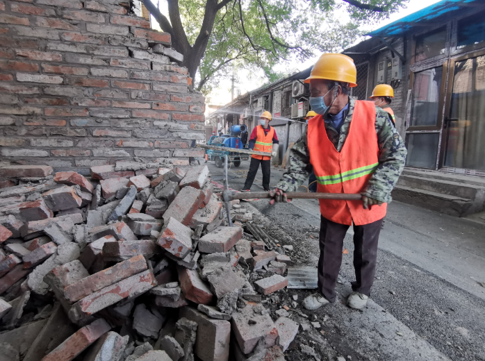 新桥胡同两侧都是低矮的平房民居,道路通行宽度不足3米,自行车、电动三轮车插空停在道旁树的树荫下,几辆机动车紧贴着房屋墙根停放,本就不宽的道路更显窄巴。为了最大限度降低对周边居民和学校的影响,整个拆除工作全部由施工人员使用大锤、铁钎手工完成,同时配备了高压水枪和除尘雾化车,确保不占道、不起尘。