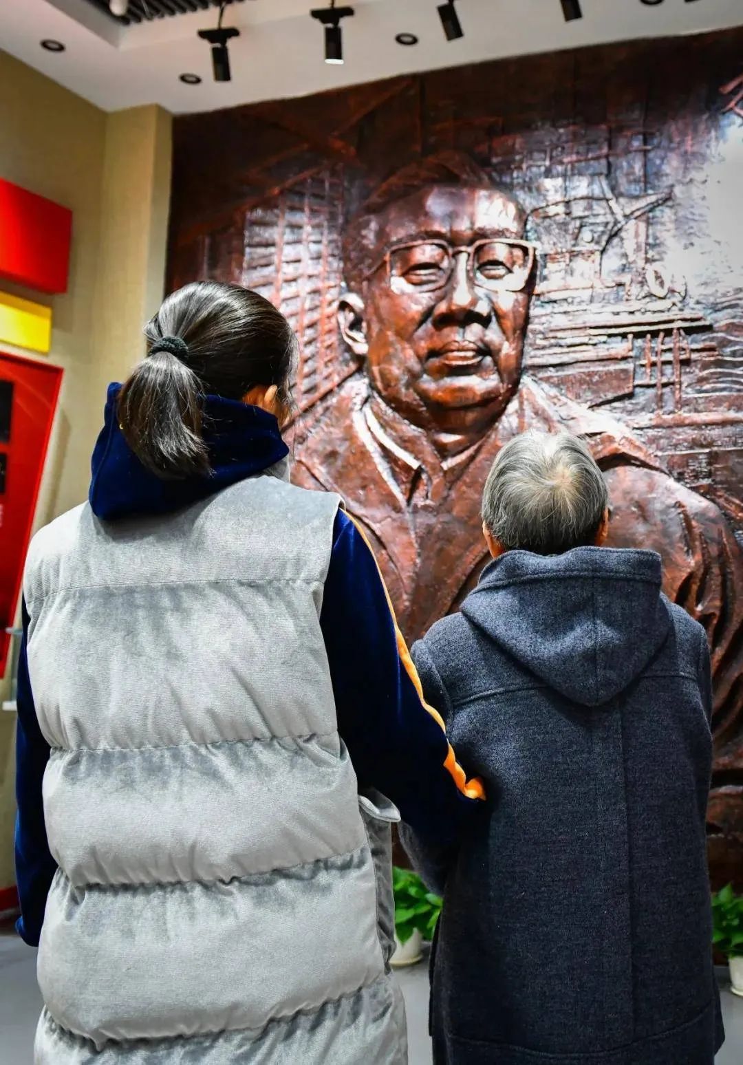 罗妈妈久久凝视着儿子罗阳的浮雕像