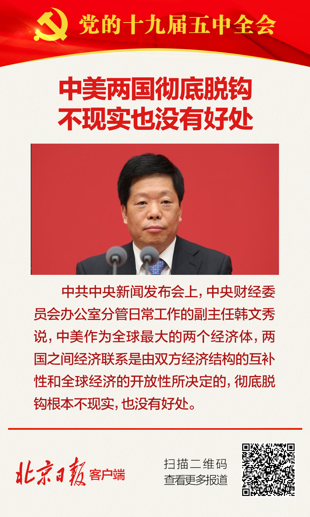 中央财经委员会办公室分管日常工作的副主任 韩文秀:中美作为全球最大的两个经济体,两国之间经济联系是由双方经济结构的互补性和全球经济的开放性所决定的,彻底脱钩根本不现实,也没有好处。