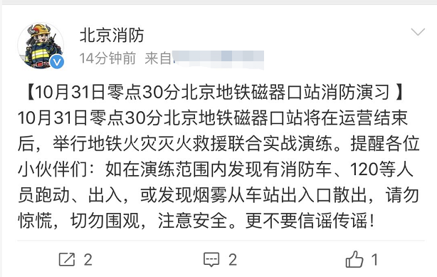 北京消防提醒市民,如在演练范围内发现有消防车、120等人员跑动、出入,或发现烟雾从车站出入口散出,请勿惊慌,切勿围观,注意安全。更不要信谣传谣!