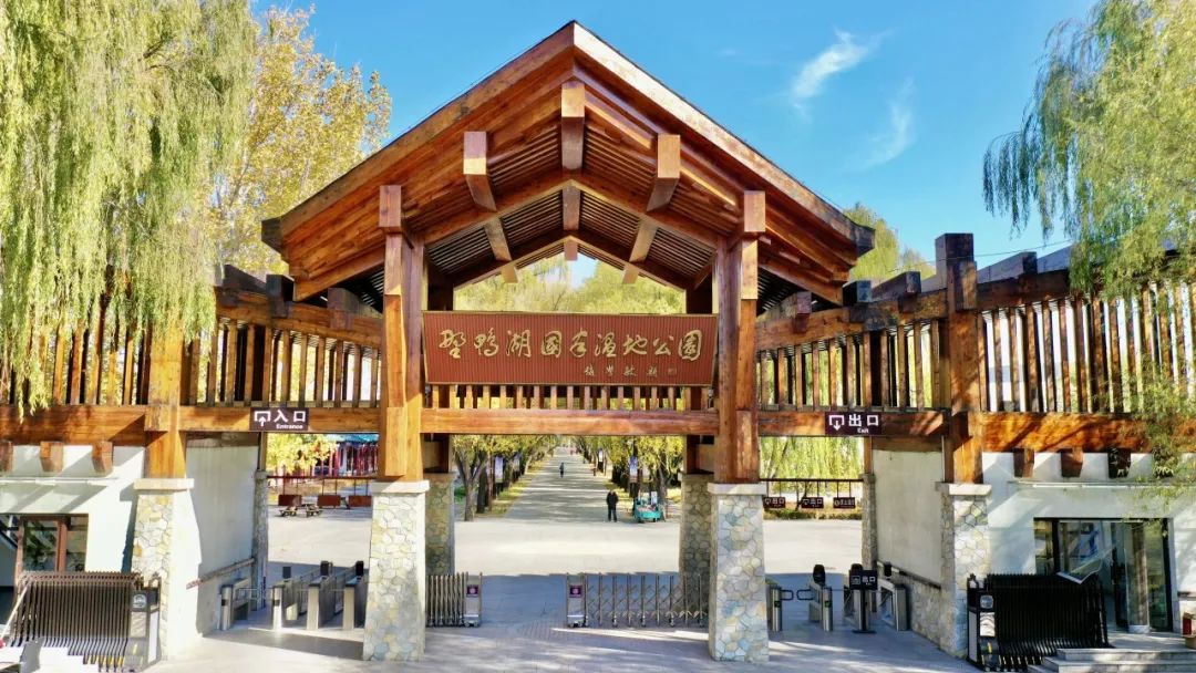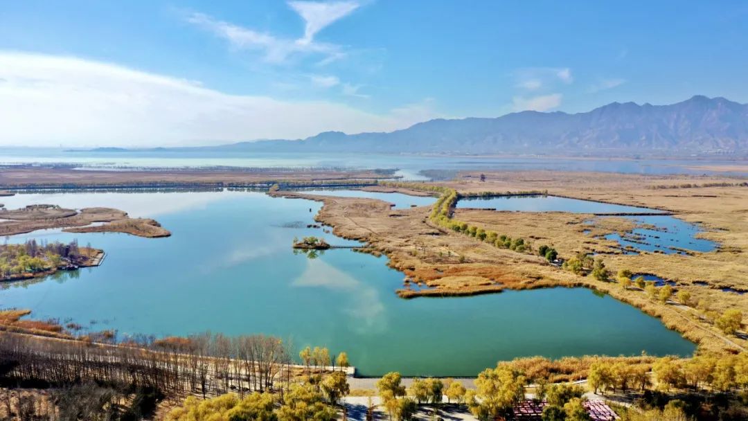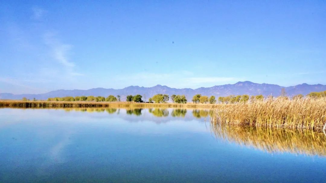 暖阳泼洒大地,微风掠过湖面,野鸭湖国家湿地公园里一片静谧景象。蓝天映碧水,树木倒影清晰可见,犹如一面光滑的镜子。