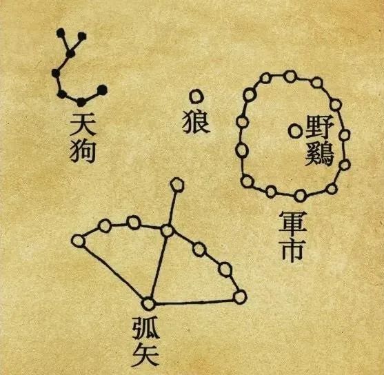 因此,为了疆土的安宁,古人专门在天狼星的东南方向设立了一个弧矢星座,用来镇住象征南夷力量的天狼星。弧矢星座由9颗星组成,就像一把张开的弓箭,箭在弦上,弓已拉圆,箭头直指西北方向的天狼星。所以就有了弧矢射天狼之说。