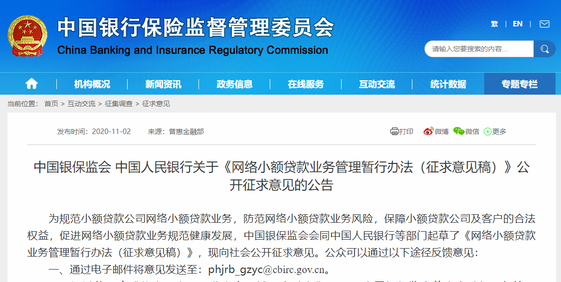 为规范小额贷款公司网络小额贷款业务,统一监管规则和经营规则,促进网络小额贷款业务规范健康发展,11月2日晚间,中国银保监会、中国人民银行就《网络小额贷款业务管理暂行办法(征求意见稿)》公开征求意见。