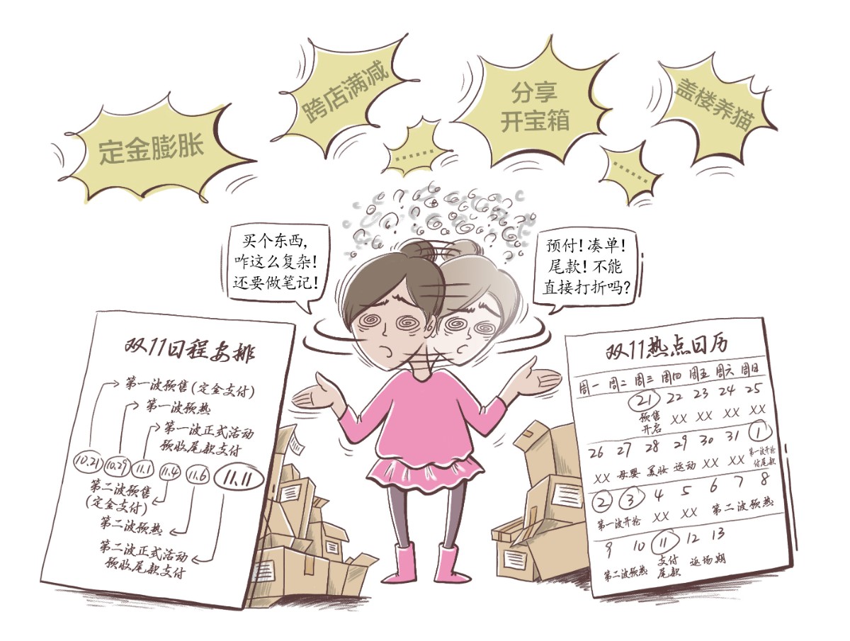 同样被促销手段绕晕的还有连续多年参加“双11”抢购的余璐。“跟往年相比,今年的名堂格外多,文字游戏越搞越离谱。”在一份“双11”攻略中,余璐看到各种名目的活动多达十余种,原本简单的红包被分成超级红包、红包加码、惊喜红包、订阅红包、天天开彩蛋、分享开宝箱等多个类别,每一类的时间点都不同,此外还要叠加跨店满减、店铺优惠券、品类购物券、N件N折等算法。