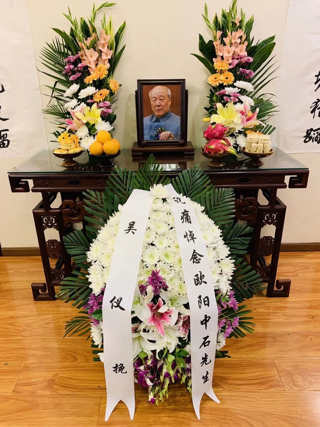 11月6日上午,第十六届中央政治局委员、原国务院副总理吴仪,派代表向欧阳中石先生敬献花圈挽联,并对中石先生家属表示慰问。