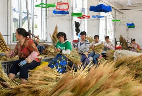 贫困户在巴林左旗林东镇扶贫车间内制作笤帚(2019年8月5日摄)。新华社记者 彭源 摄