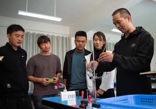 北京市援青支教教师、来自通州区陆辛庄学校的化学教师祁生贵(右一)在青海省玉树州第四民族高级中学指导学校教师进行实验教学(8月12日摄)。新华社记者 陈钟昊 摄
