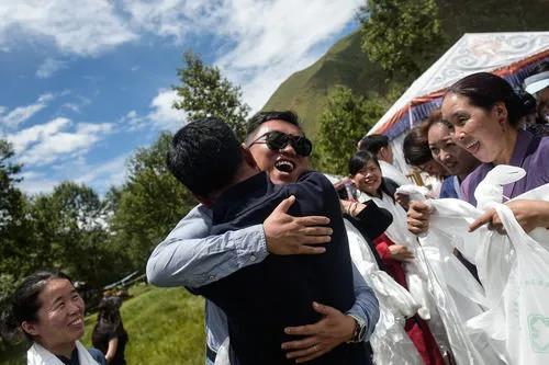 在西藏拉萨市达孜区,北京大学肿瘤医院的援藏医生袁灿(带墨镜者)与送别的藏族同事拥抱(8月1日摄)。新华社记者 彭子洋 摄