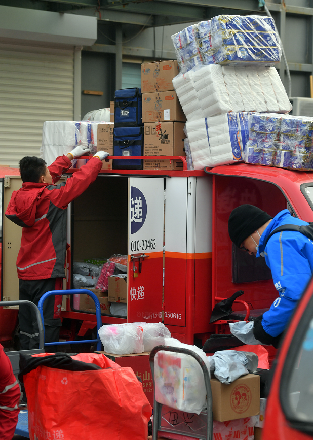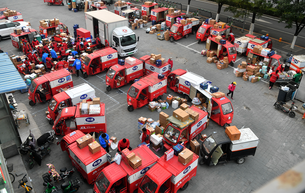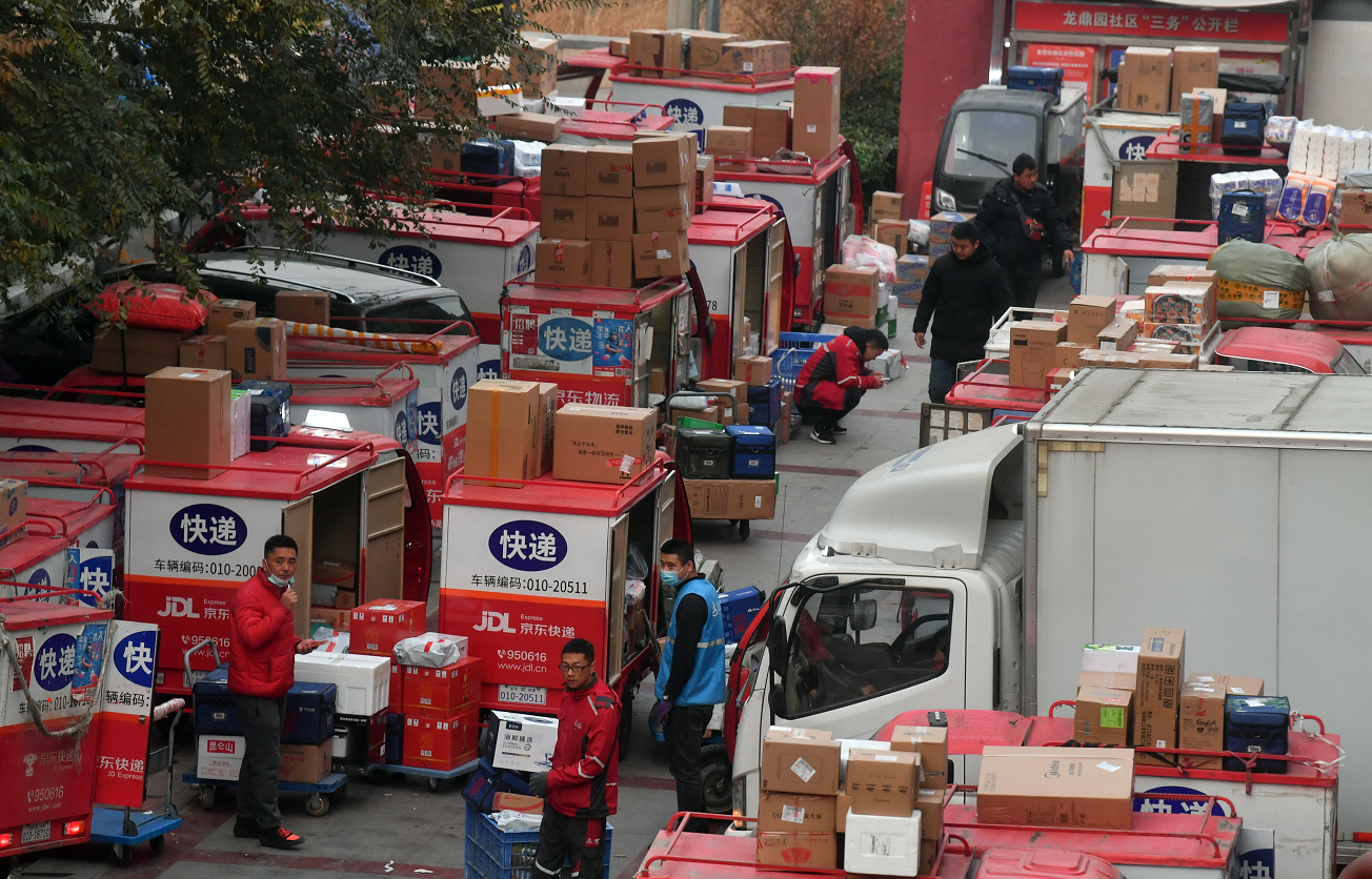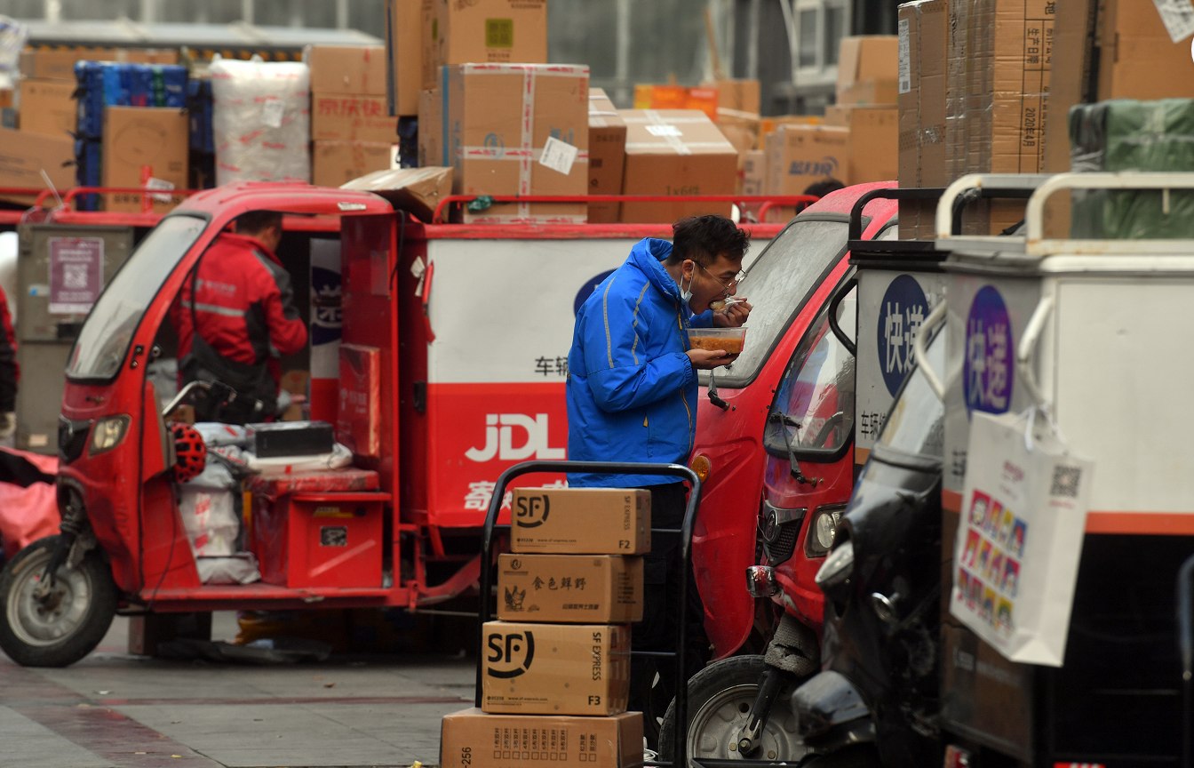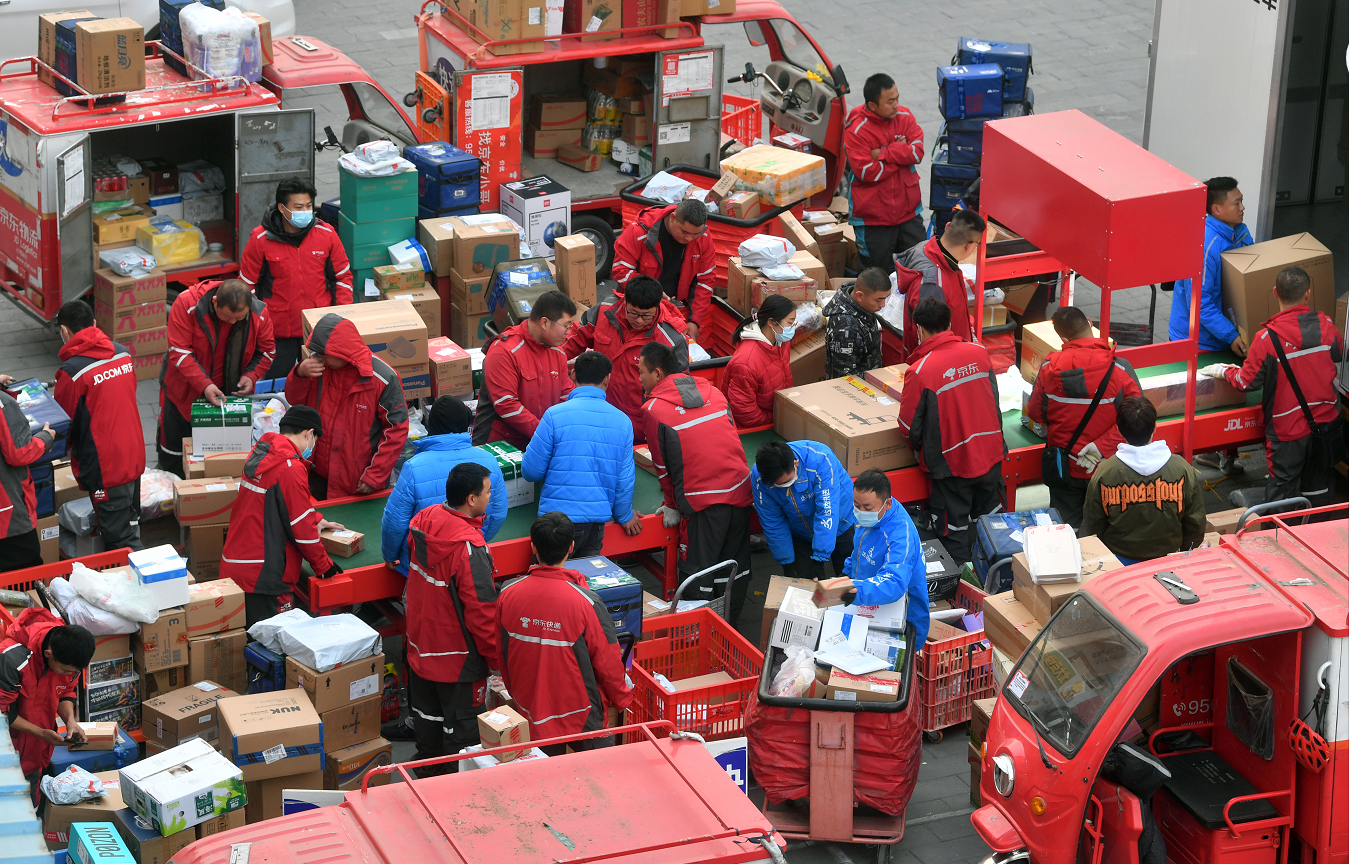 2020年11月11日,在北京通州一快递站点,快递小哥在进行分拣工作。当日是双十一电商大促,各家快递爆棚。