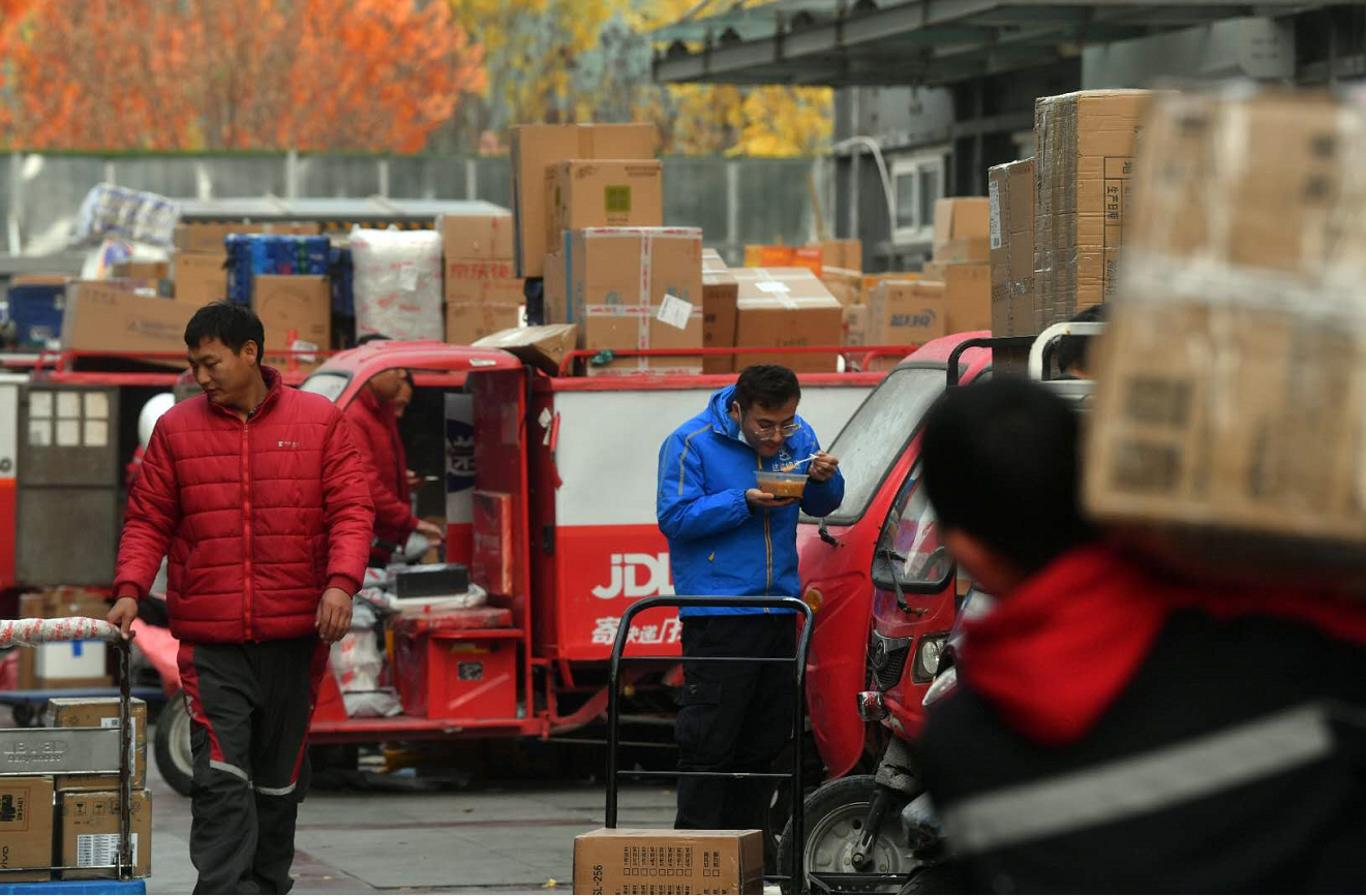 在北京通州一快递站点,快递小哥在工作间隙吃早餐。