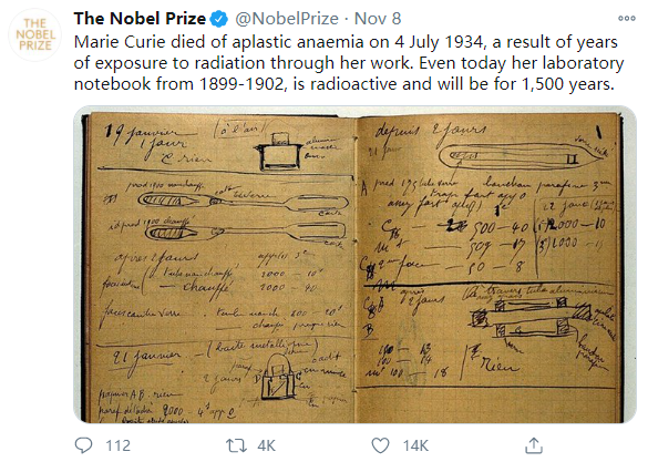 推特内容中提到,玛丽·居里(Marie Curie)于1934年死于再生障碍性贫血,她工作多年,一直暴露在放射线下。即使到今天,她自1899年至1902年在实验室中使用的笔记本仍具放射性,并将持续1500年。
