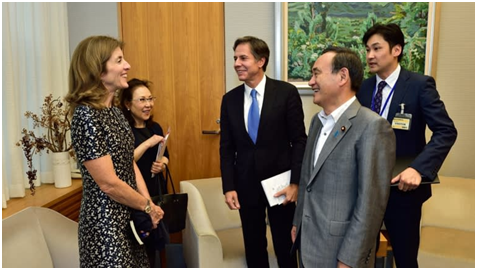 2015年10月,时任美国驻日本大使卡罗琳·肯尼迪(最左)和副国务卿安东尼·布林肯(中)在东京首相官邸与时任日本官房长官菅义伟(前右)会面(资料图)
