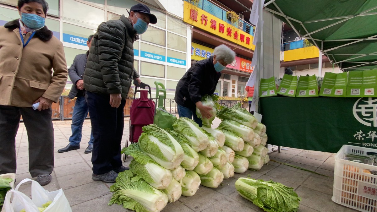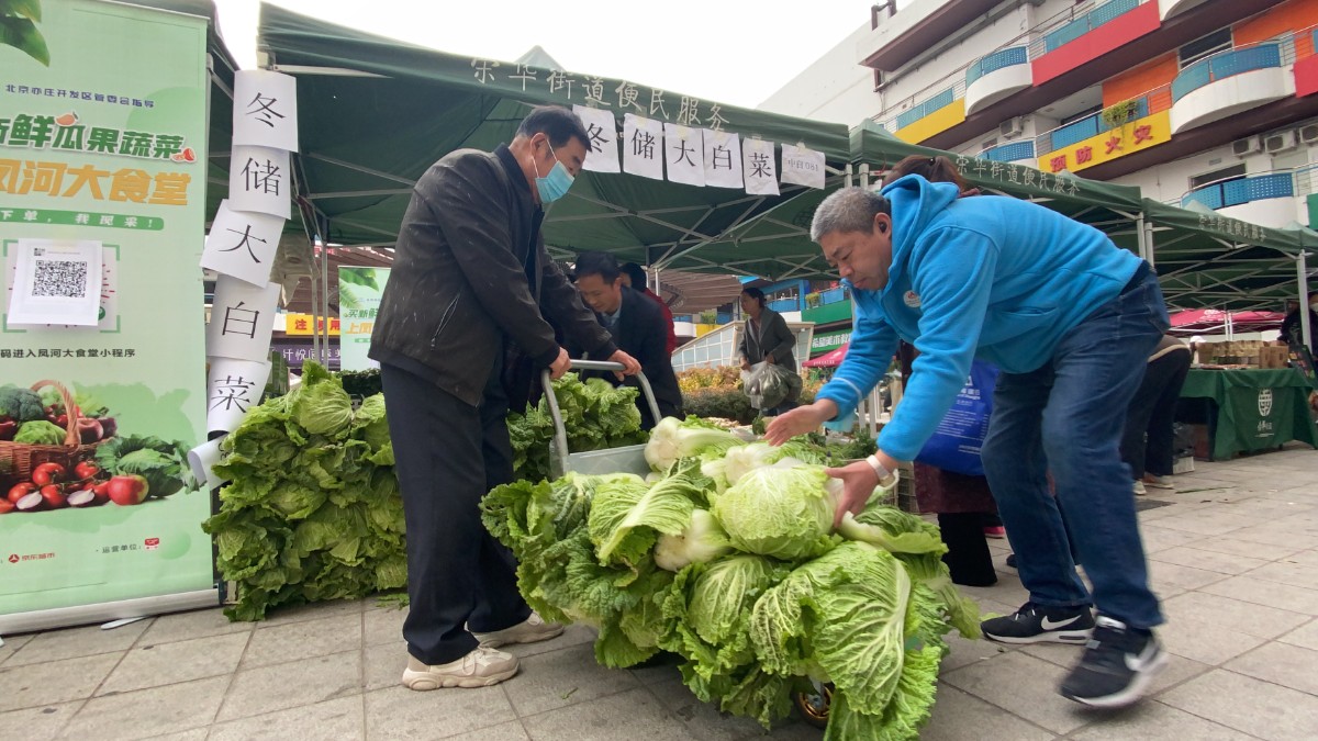 帐篷下正在忙着搬菜的大兴区长子营镇小黑垡村第一书记华鹏介绍,这些菜均来自长子营、采育镇等蔬菜基地直采;尤其是大白菜,是农科院的新品种,价格实惠、品质有保证。“第一场售卖活动是在郁金香舍小区,光是大白菜就卖了1吨!今天特意准备了2吨!”居民的青睐让摊主王光辉难掩喜悦。