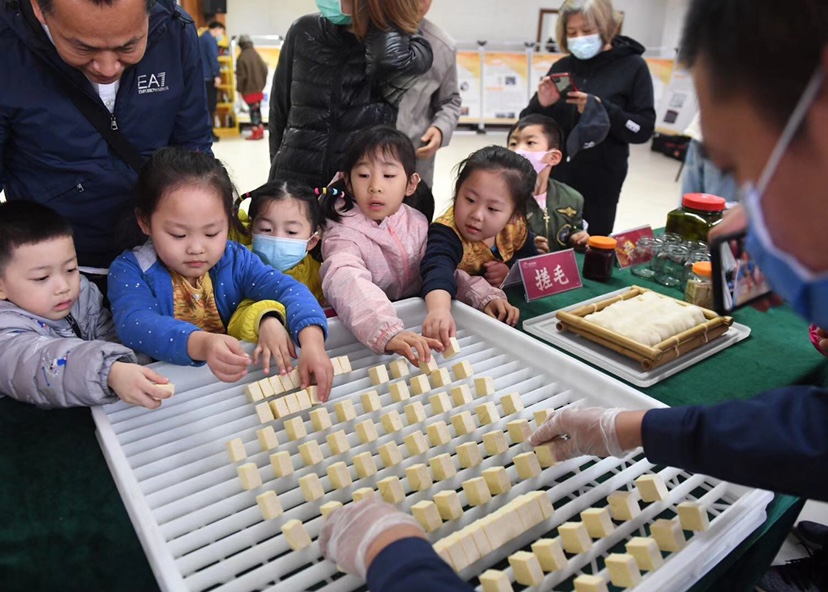 除了来看热闹的“门外汉”,现场还有不少“看门道”的懂行人。是什么让红方腐乳和青方腐乳的味道不同?为什么搓毛之后豆腐块会变小?过去自己家里做腐乳,菌丝为什么会容易发黑发灰?对于不少上了岁数的老年人来说,王致和展示出的一道道工序勾起了不少人在家里自制豆腐乳的回忆。