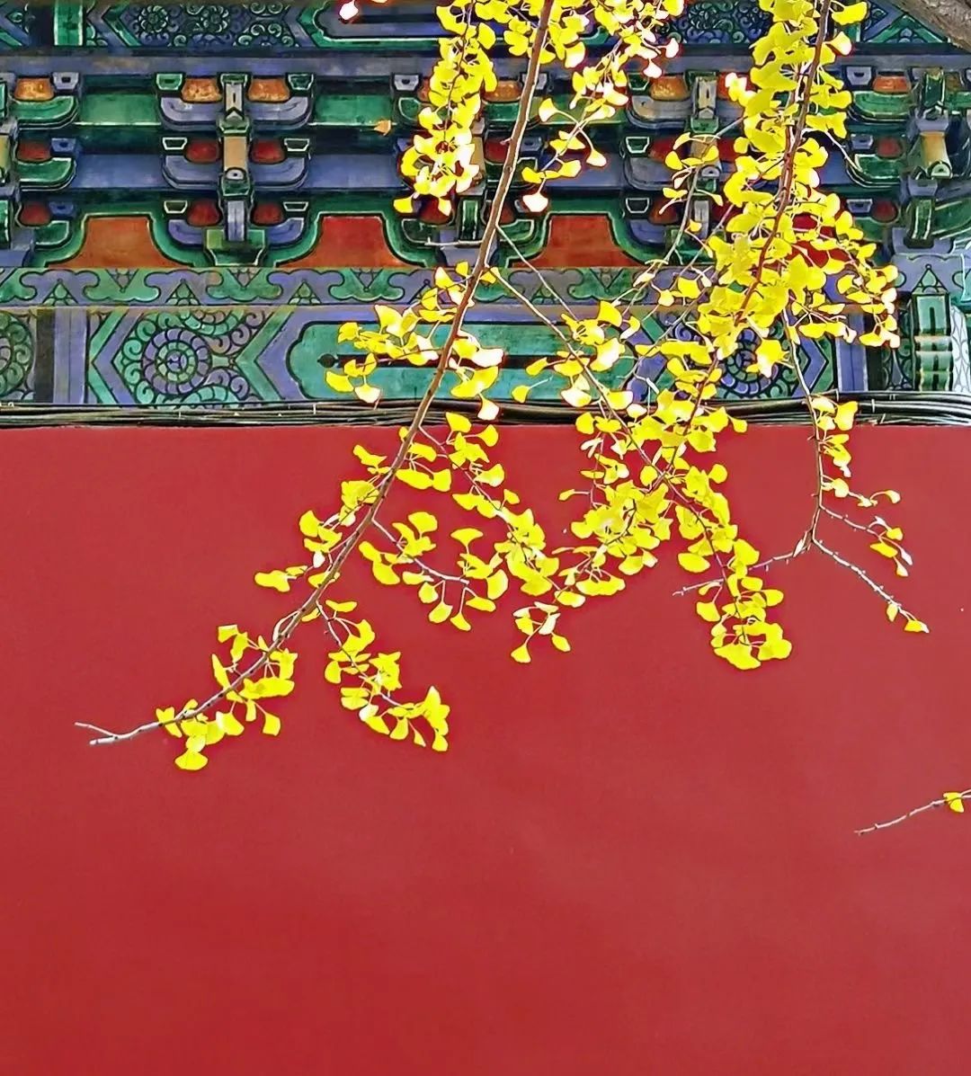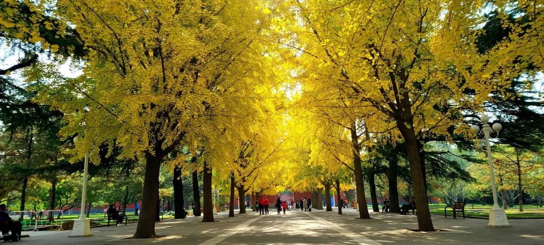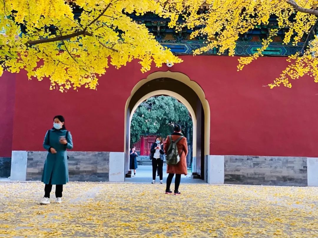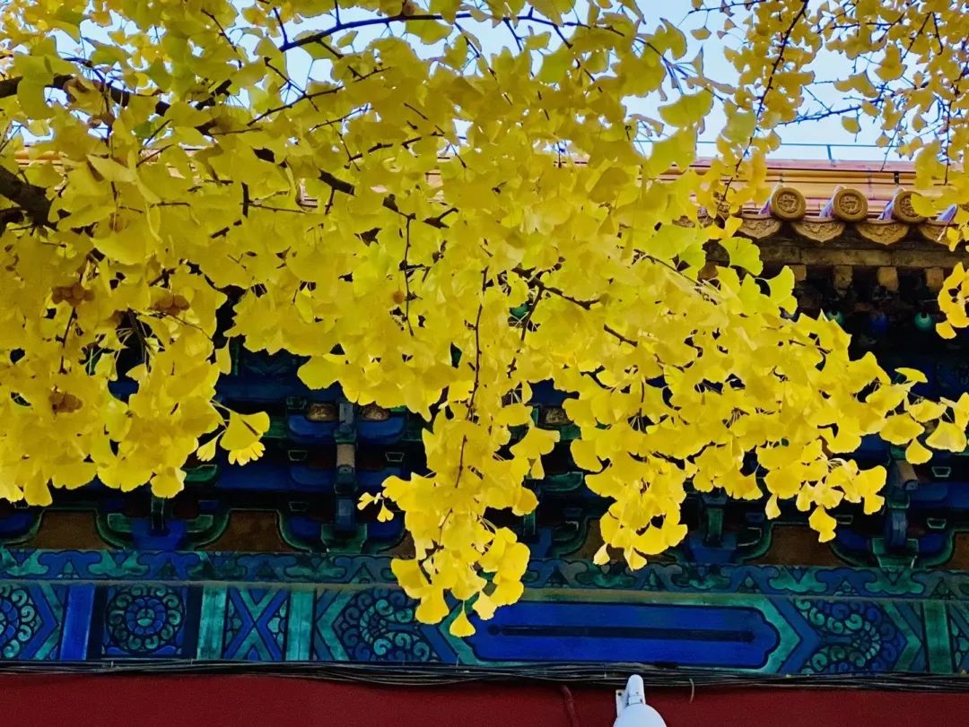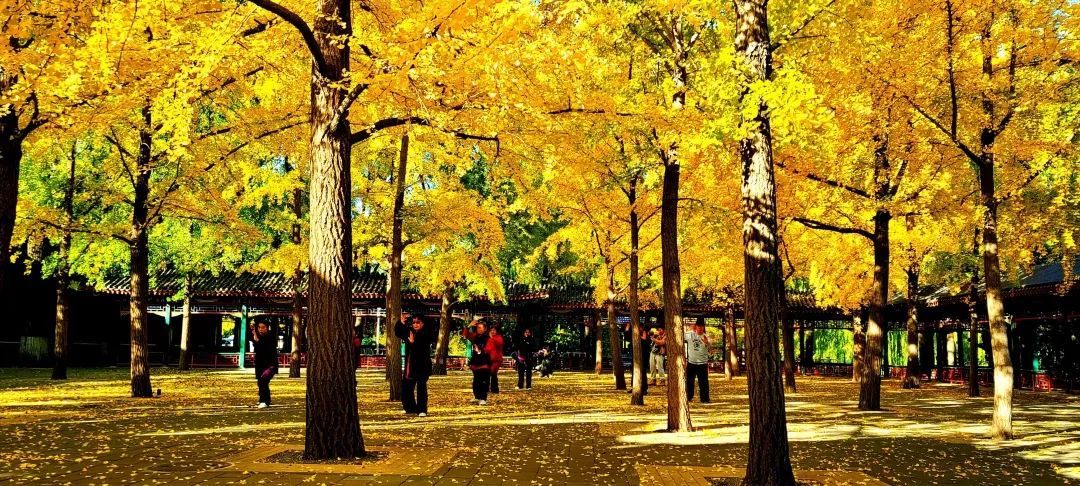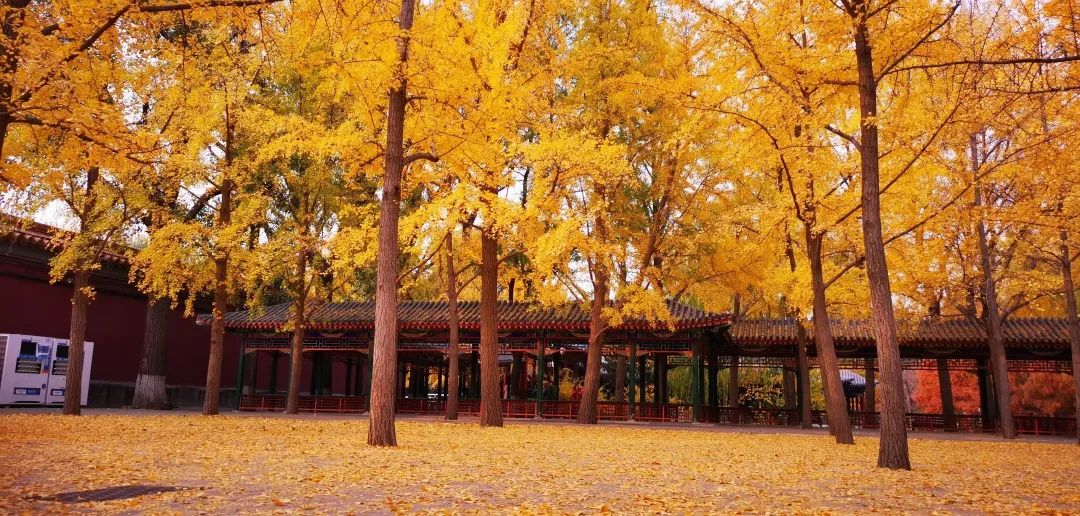 几十株金黄色的银杏在彩绘长廊、红墙金瓦的映衬下格外绚丽,在树下小憩一会,真是令人心旷神怡,不禁感叹京城秋色如此迷人!