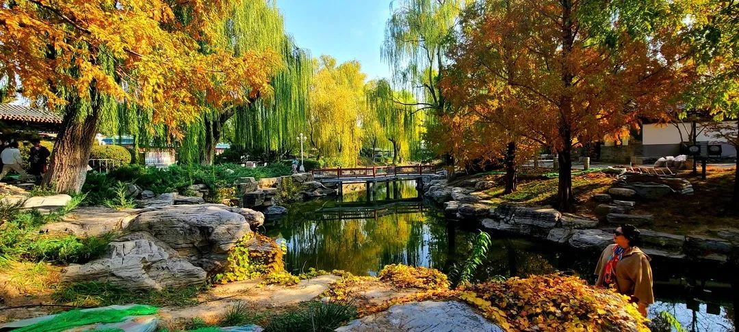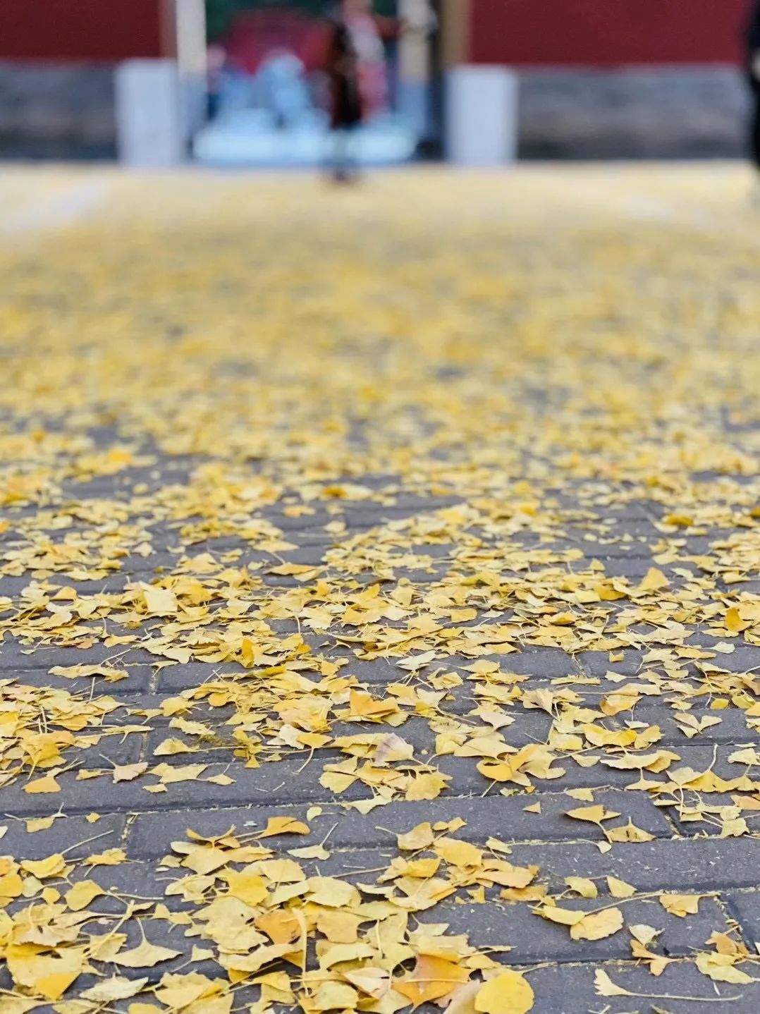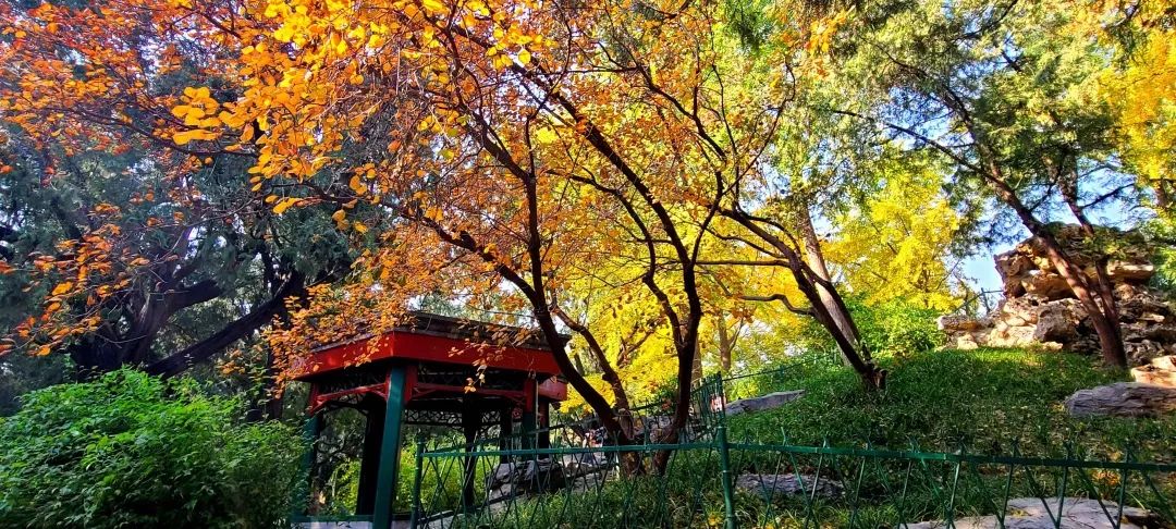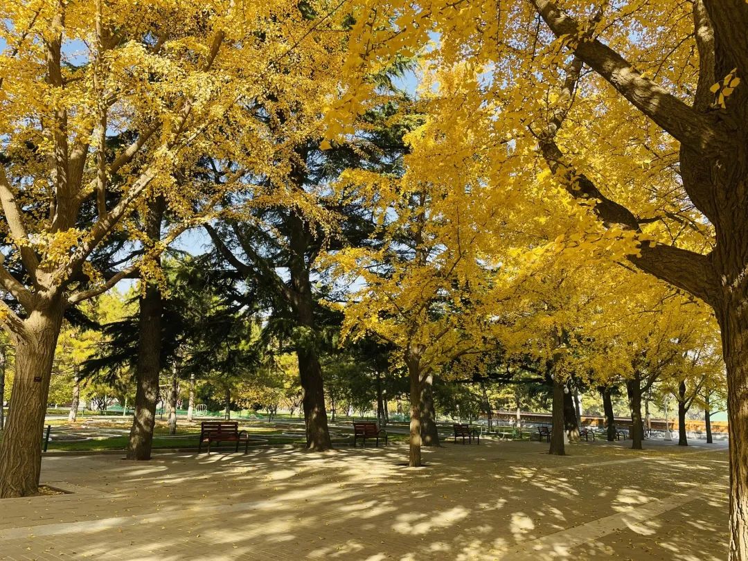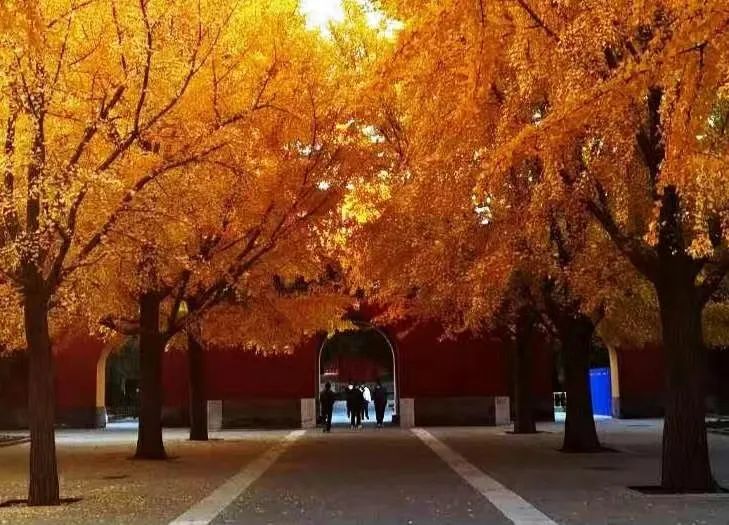 几十株金黄色的银杏在彩绘长廊、红墙金瓦的映衬下格外绚丽,在树下小憩一会,真是令人心旷神怡,不禁感叹京城秋色如此迷人!