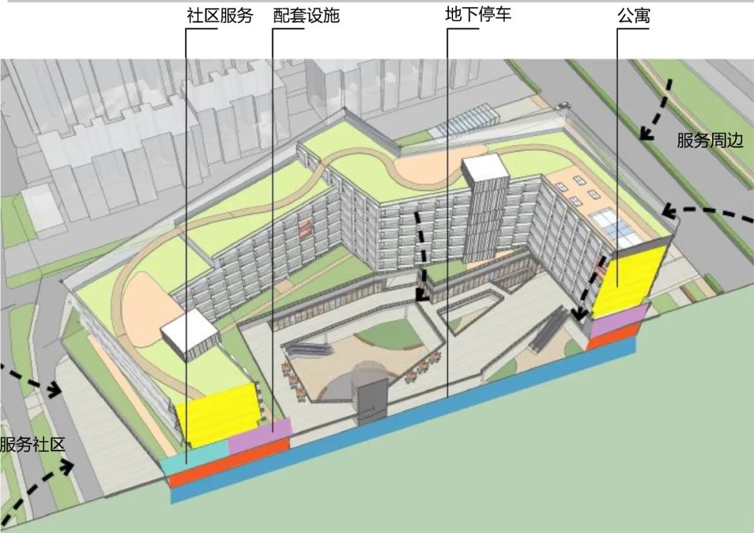 其中,地下一层,首层及二层东侧部分为配套服务用房(其他商业服务),建筑西侧二层至六层为居住楼层,东侧三层至八层为居住楼层。设两层地下停车库,提供385个停车位。