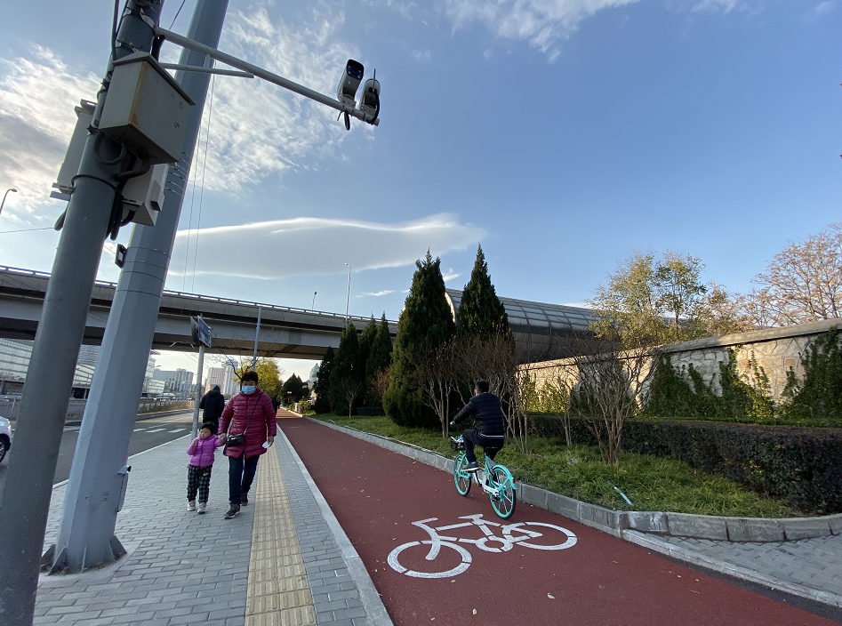 “妈妈,你看这条路是红色的,真漂亮!”北京动物园门前辅路上,一个小女孩兴奋地说。此时,这条铺了“红毯”的自行车道上,零星点缀着黄色落叶,十分漂亮。记者注意到,这条自行车道与机动车道之间,通过人行步道隔离开,骑行不再受干扰。过去,市民在西外大街骑行可没这么痛快。