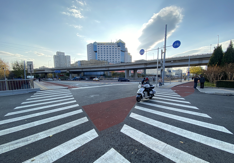 此外,在立交桥区机非交叉位置,以及北京动物园门口机动车与非机动车事故高发地区,铺设了彩色铺装,西外大街全线非机动车道施划自行车标识165个,保障非机动车出行路权。