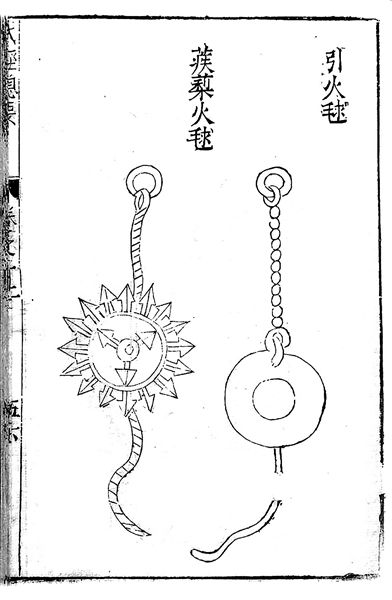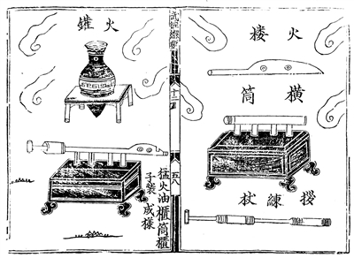 仁宗庆历年间,由天章阁待制曾公亮与翰林学士承旨丁度主持编纂的我国历史上第一部官修大型军事百科全书《武经总要》,则比较详细地记载了宋军装备的火球类火器、火药箭类火器等重要火药武器。火球类火器有火球、毒药火球、蒺藜火球、霹雳火球、烟球、竹火鹞、铁嘴火鹞等;火药箭类火器有弓火药箭、弩火药箭、火药鞭箭等。这些火药武器是我国古代最早应用于军事的火器,被称为“军中之利器”。