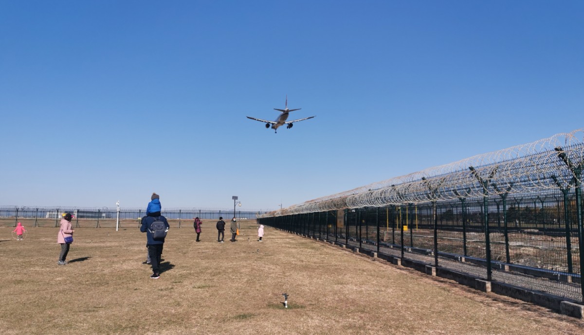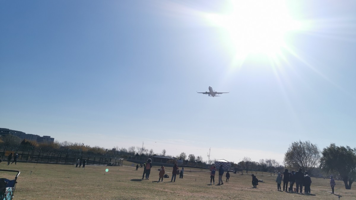 伴随着轰鸣声,南方的天空远远地出现了一个闪亮的小亮点。轰鸣声越来越大,飞机也从一个小点慢慢变大。巨大的机身从人们的头顶缓缓滑过,最后降落到了与公园一网之隔的机场停机坪。不到半个小时,5架飞机从人们头顶飞过。每过一架飞机,公园里便会响起孩子们的欢呼雀跃声。