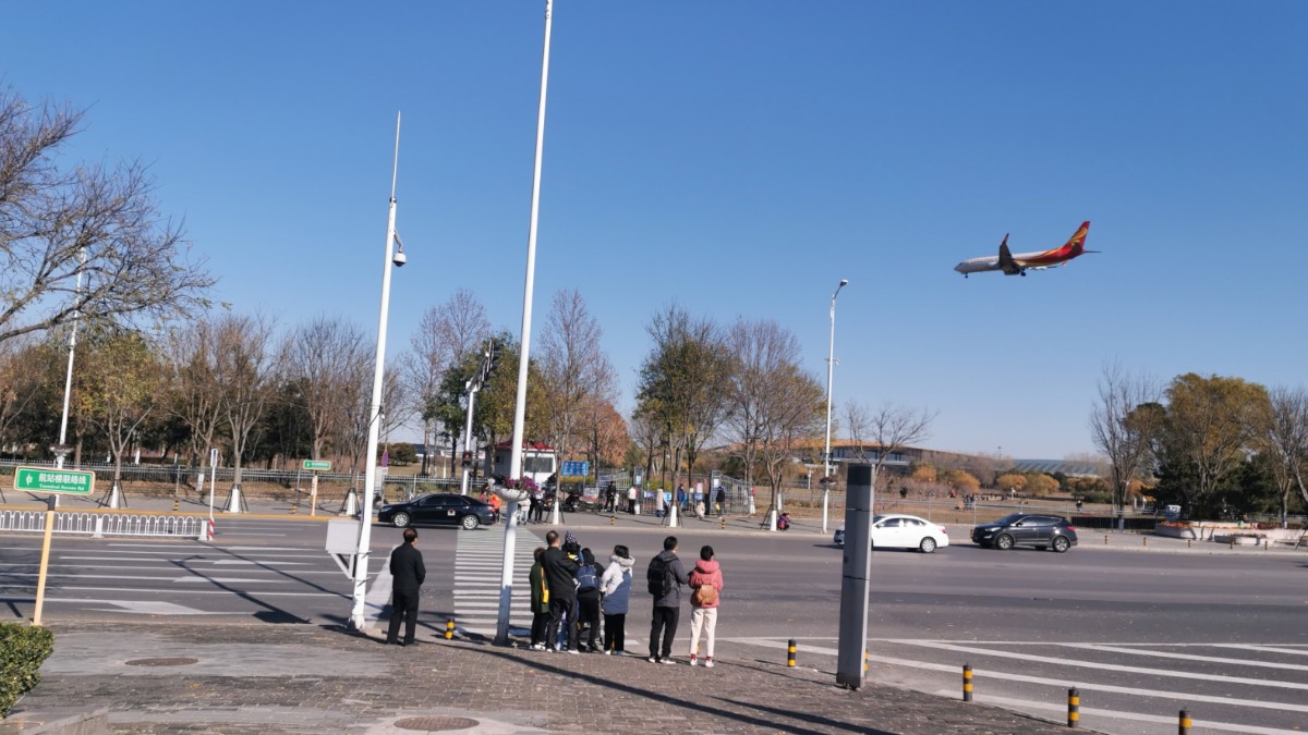 “快看,大飞机!”伴随着由远及近的轰鸣声,一架客机呼啸着从头顶飞过,直直地冲向跑道。今天上午,在首都机场T3航站楼西侧的西湖园里,不少人都在驻足观看从头顶掠过的飞机,这座公园因为可以近距离观看飞机起落成了网红。