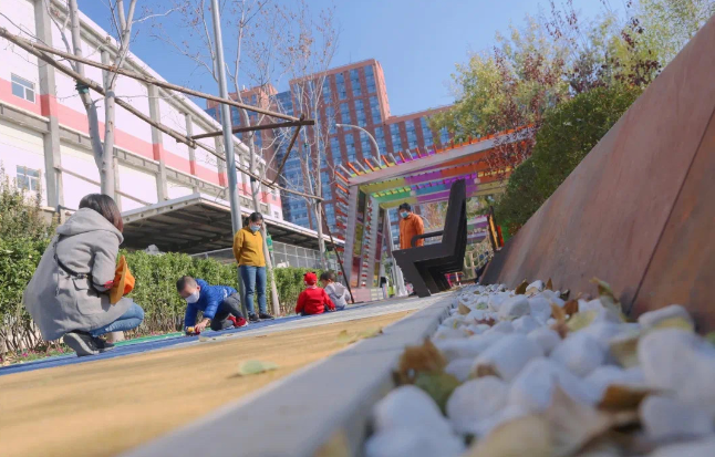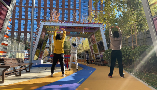 “数一数,这都有什么颜色呀?”正午天气晴好,居民范女士在自家楼下耐心地引导3岁的儿子辨识颜色。眼前是五彩缤纷的几何线条搭起的三组景观廊架,地面的彩色塑胶道,外加四季常青的丰富植被,让这处1134平方米的区域在冬日里也充满活力与时尚。
