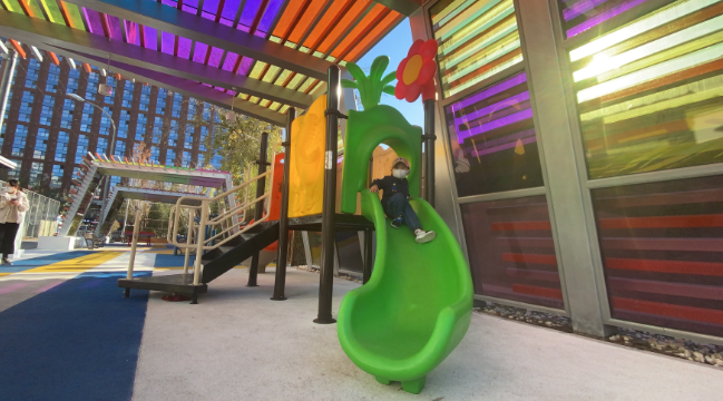 “快来啊,这儿有阳光,还有滑梯呢!”范女士一边看着儿子玩耍,一边忙着约其他宝妈来打卡。她就住在公园东侧的世纪茶贸中心,晚间发现了这处路灯下的缤纷世界,于是转过天来特意带孩子来玩。