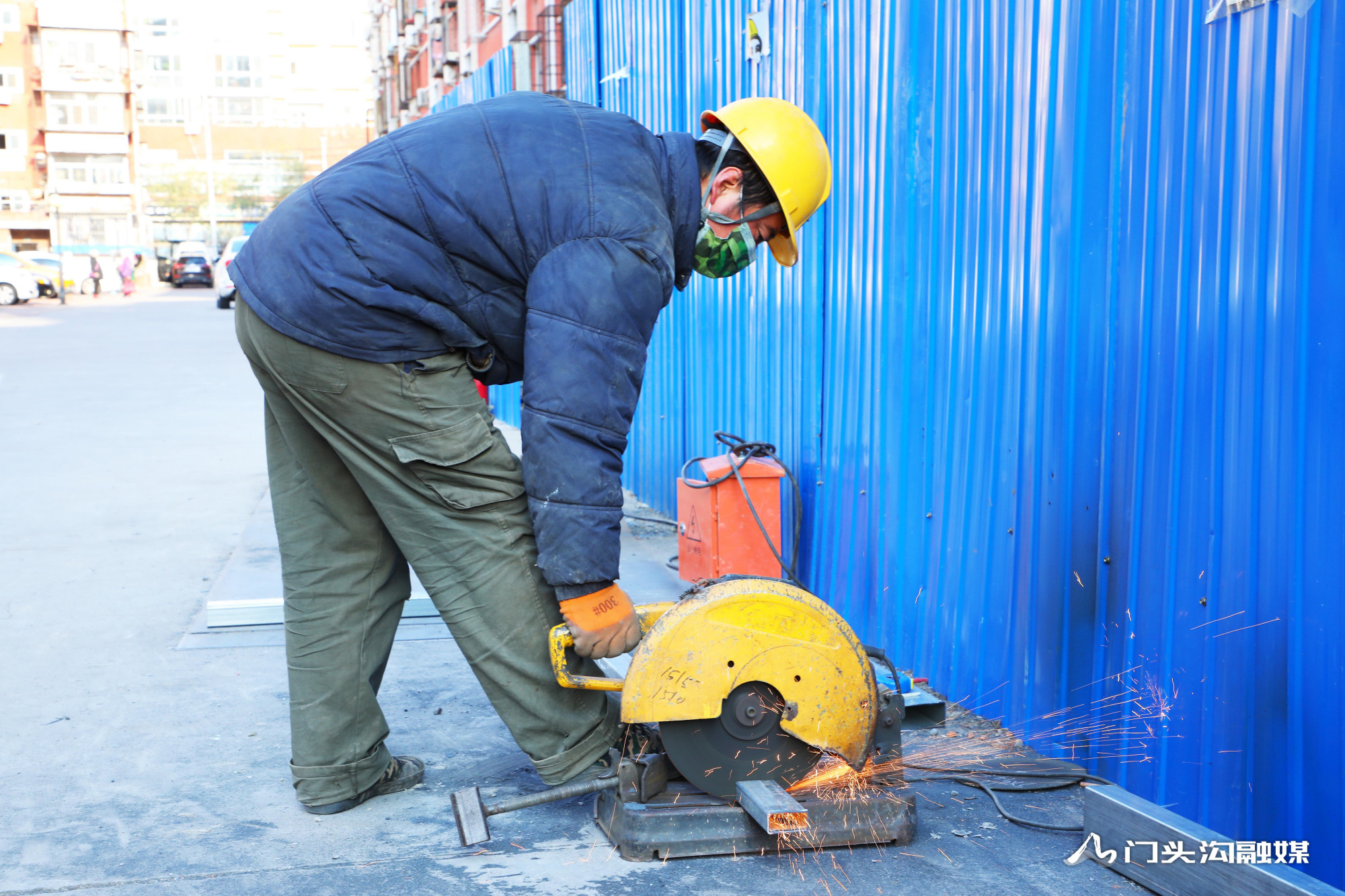 12号楼的施工现场,新增设的电梯钢结构井道已吊装完成,施工人员正在围挡内进行焊接、切割作业。旁边两部崭新的透明电梯在楼前拔地而起,正等待竣工验收。