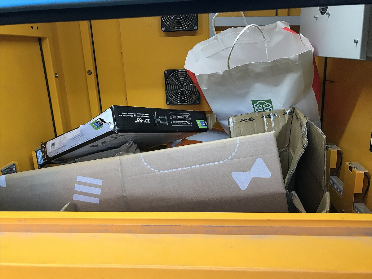 这台回收机的使用率如何呢?记者点击屏幕打开了柜门:纺织物柜子里面有两件衣物,最上面的是一件黑色棉衣;装塑料瓶的柜子里有几个装牛奶的空盒子。和放置在小区北门的回收机一样,这台回收机中,回收的纸类垃圾最多。
