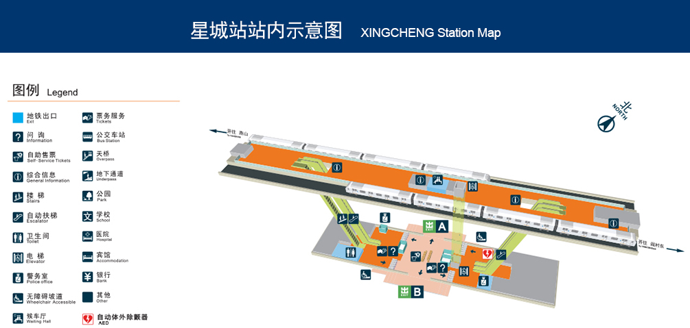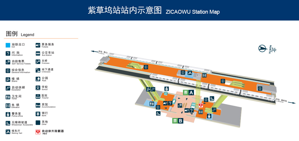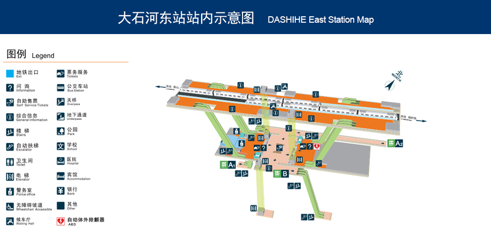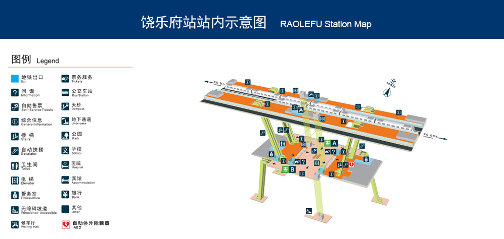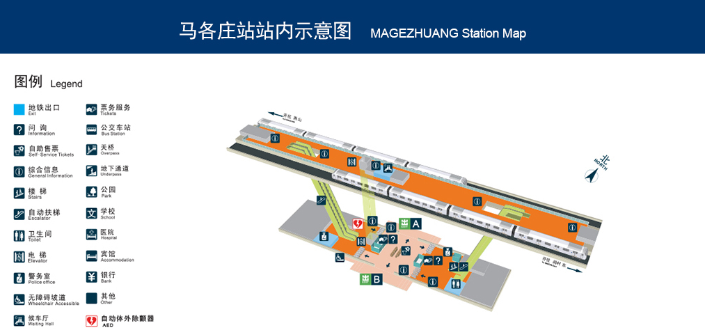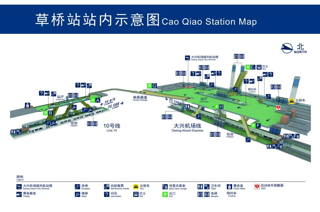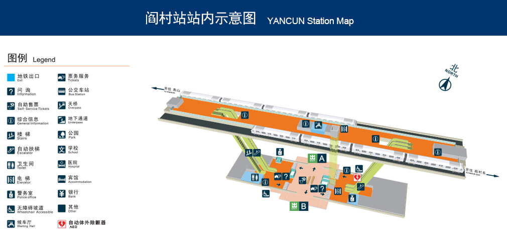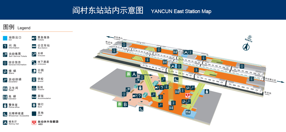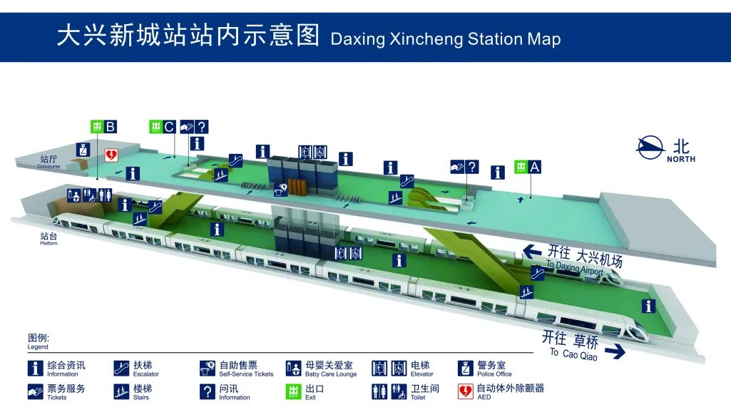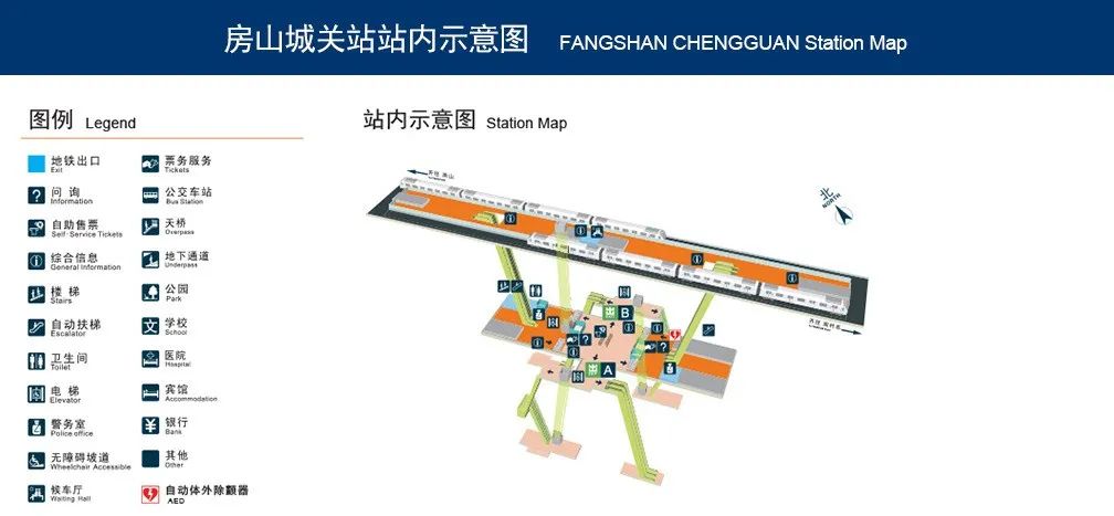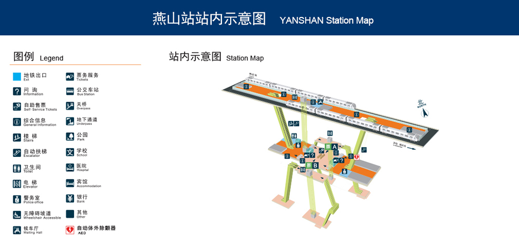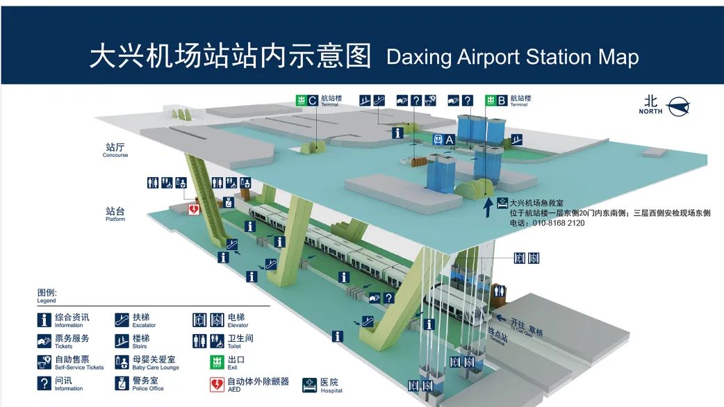 为了让乘客第一时间了解车站AED设备的安装位置,获取更多急救信息,燕房线、大兴机场线所有车站在进站明显位置均张贴AED提示及车站三维AED导引,街区图增加周边医疗点位置、距离、电话等信息。