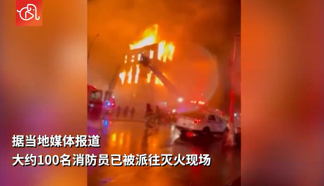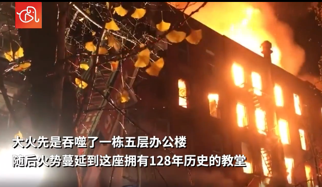 大火先是吞噬了一栋五层办公楼,随后火势蔓延到这座拥有128年历史的教堂。据当地媒体报道,大约100名消防员已被派往灭火现场。