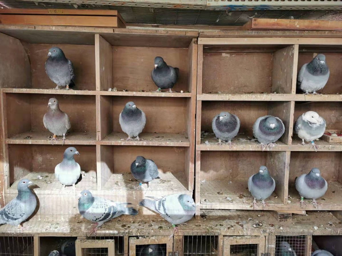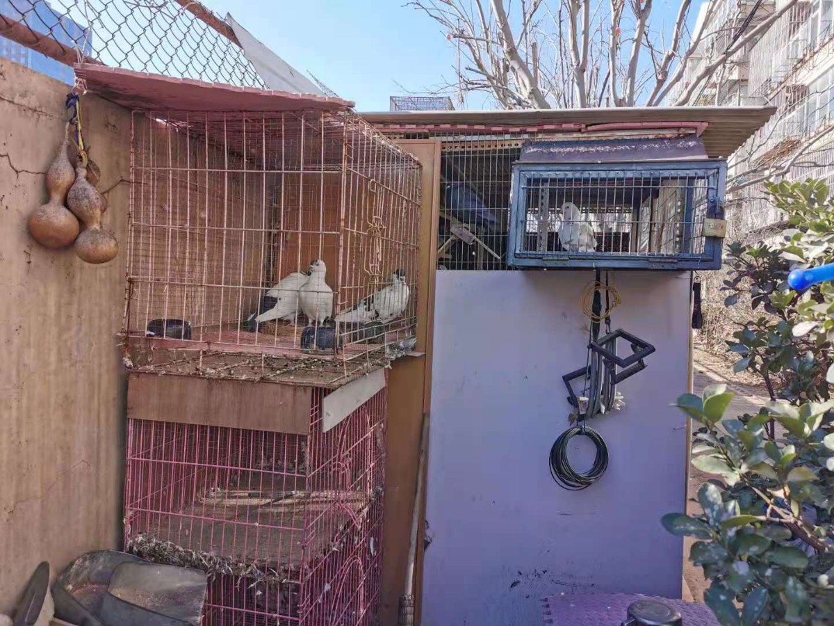鸽舍上着锁。一靠近鸽舍,记者便听到里面鸽子惊慌地扑翅声。隔着木板间缝隙,鸽舍内数十只灰鸽缩着脑袋站在木格里,鸽子腿上还套有不同颜色的足环。鸽舍门上钉着一张带有“北京市信鸽协会”字样的铭牌。鸽舍北侧放着几只鸟笼,一只笼内锁着3只灰白花纹的鸽子,这些鸽子腿上未戴足环。