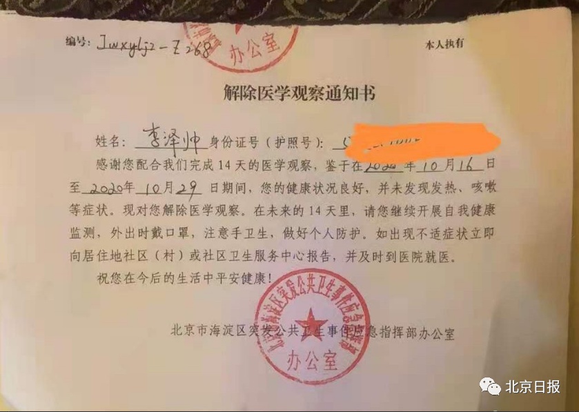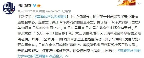 据了解,李泽帅21岁,2020年10月16日从加拿大回北京,10月16号至10月29号在北京集中隔离14天后,又在北京待了10天,于11月8日晚上从北京回到泰悦湾小区,均有核酸检测报告及隔离证明。11月8日至12月5日期间并未去过上述地区活动,并于12月6日凌晨4点多开车至南充,目前在南充回成都的高速上。泰悦湾物业已经联系社区工作人员,等他回成都后,对其进行核酸检测。请各位网友不信谣、不传谣!