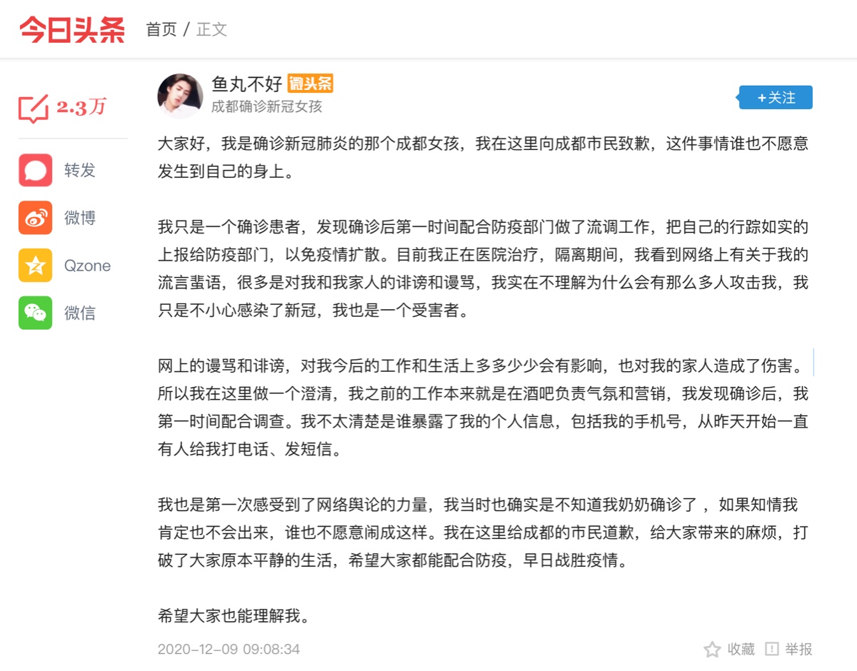 12月9日上午,成都确诊患者赵某(女,20岁,7日确诊病例卢某某孙女)在今日头条平台上发文,表示向成都市民致歉,希望大家都能配合防疫,早日战胜疫情。