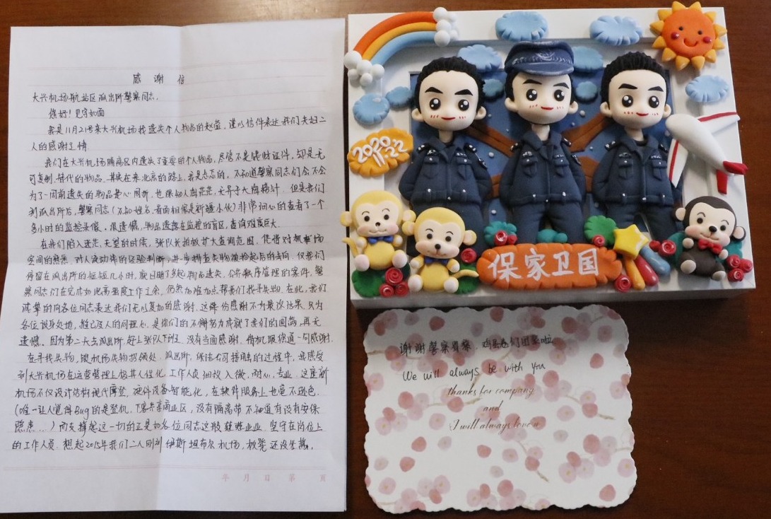 12月6日,首都机场公安局北京大兴国际机场航站区派出所民警收到了一份特殊的礼物——一个可爱的手工相框。相框里的主角是三名民警的卡通形象,边缘点缀着蓝天、飞机,还有三只可爱的小猴子,下面写着“保家卫国”。随礼物而来的还有一封手写的感谢信。收到礼物的民警会心一笑,这背后是个关于一只玩具小猴的暖心故事。