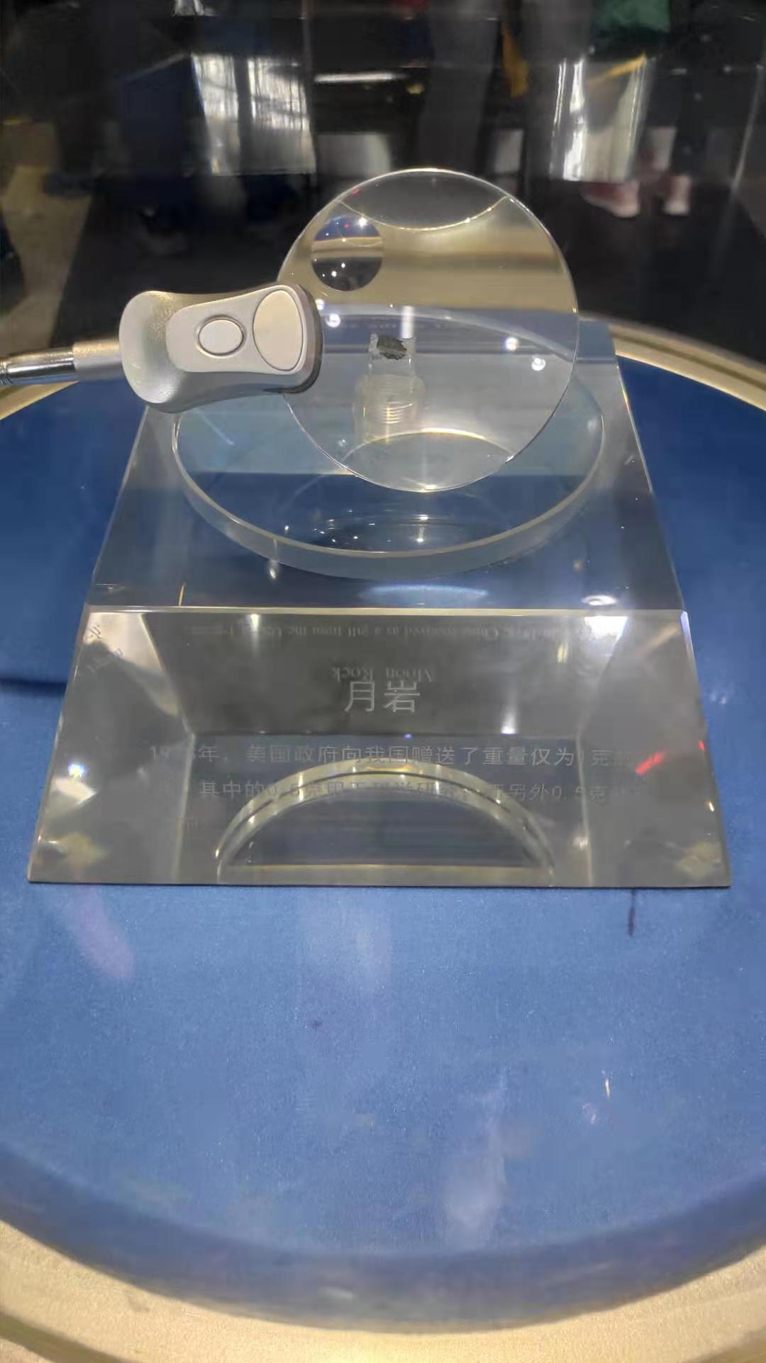 “1978年,美国政府向我国赠送了重量仅为1克的月岩样品,其中的0.5克用于科学研究;另外0.5克就在您的眼前。”张先生给10岁的儿子一顿一顿地读完“小石头”下面的解说,“儿子,这可是从月球上来的岩石!特别珍贵!”小男孩儿眼睛亮了。