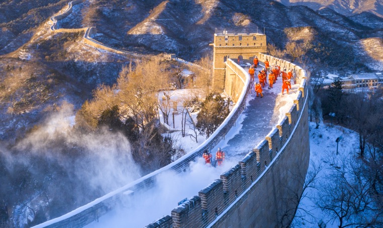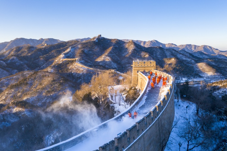 今天上午,暖阳洒下,登城远眺,八达岭长城披上了白衣,在崇山峻岭之间盘旋蜿蜒,远山青黛、近树婆娑,一幅水墨丹青画呈现眼前。寒风挡不住游人脚步,恰逢周末,前来登城赏雪景的游客络绎不绝。长城出入口、南北烽火台上,来自景区环境保洁中心的工人们忙个不停,将积雪一一扫去,让游人安全登城。