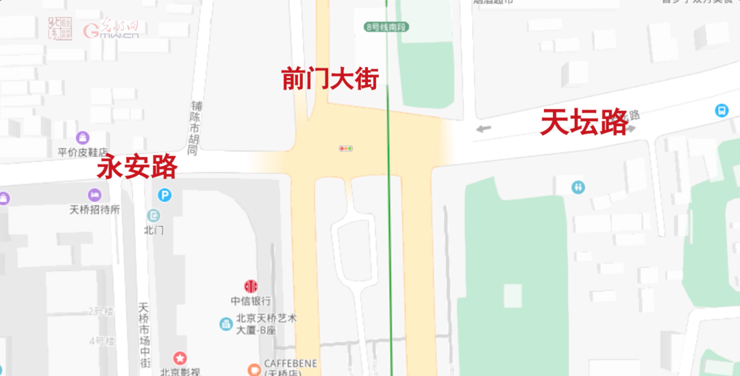 天桥的位置就是现在从前门大街往南走到珠市口大街,再往南,永安路那条横马路,再往东走,就是天坛北门那条马路了。