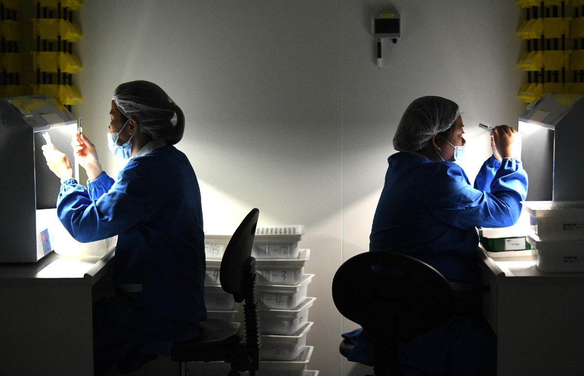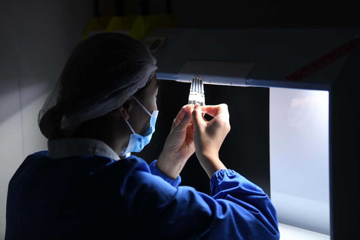 完成灌装、包装的疫苗还需要通过严格的灯检。王雪松说:“瓶身有划痕、疫苗液有异物等都算瑕疵,会被挑出去。”