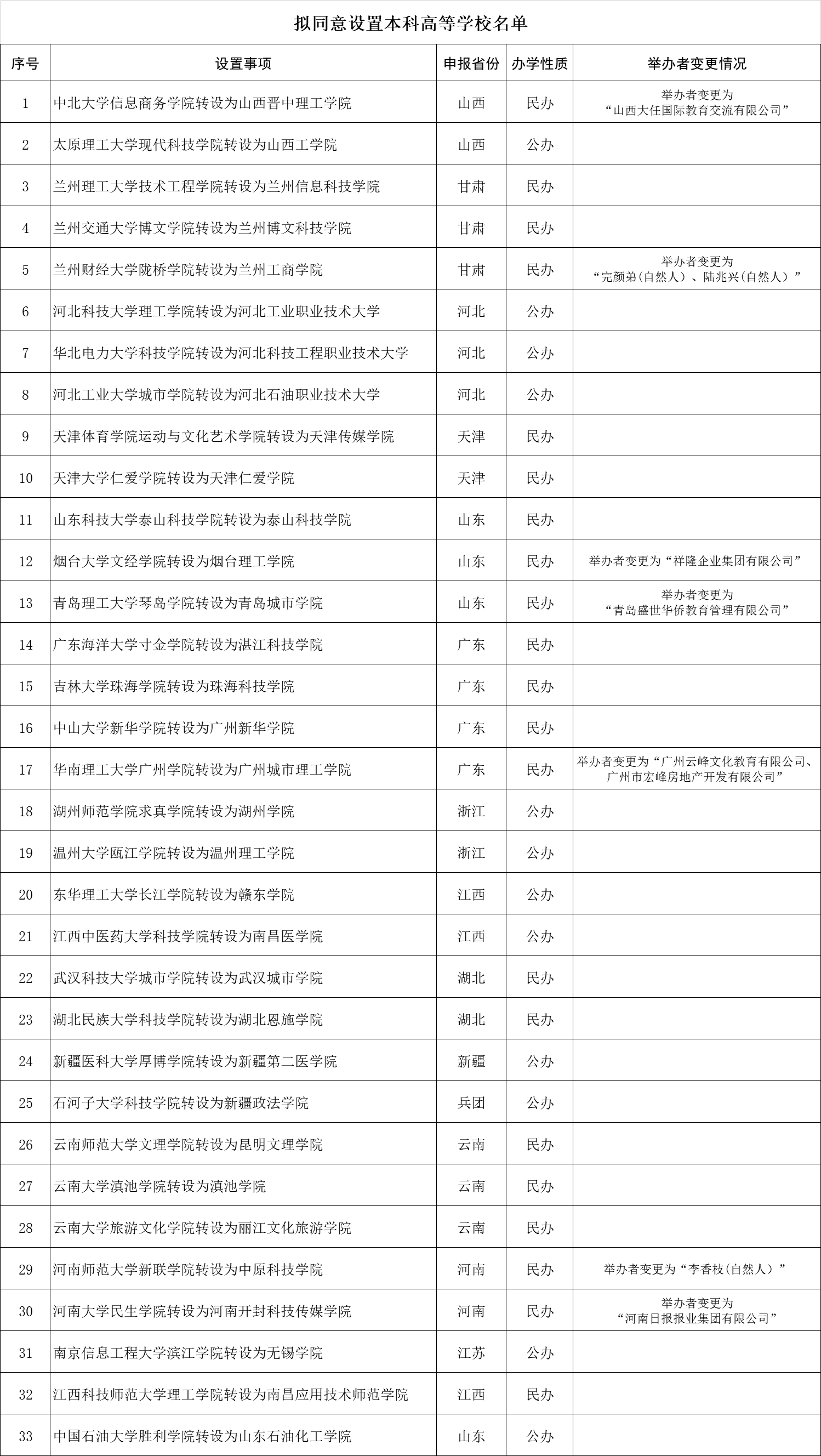 教育部发展规划司公示消息提到,根据《高等教育法》《普通高等学校设置暂行条例》《普通本科学校设置暂行规定》和《关于加快推进独立学院转设工作的实施方案》等法律法规政策规定,经第七届全国高等学校设置评议委员会专家考察和评议,并经党组会审议,拟同意中北大学信息商务学院等33所独立学院转设为独立设置的本科学校。