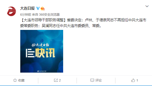 据@大连日报 今日消息,省委决定:卢林、于德泉同志不再担任中共大连市委常委职务;吴澜同志任中共大连市委委员、常委。