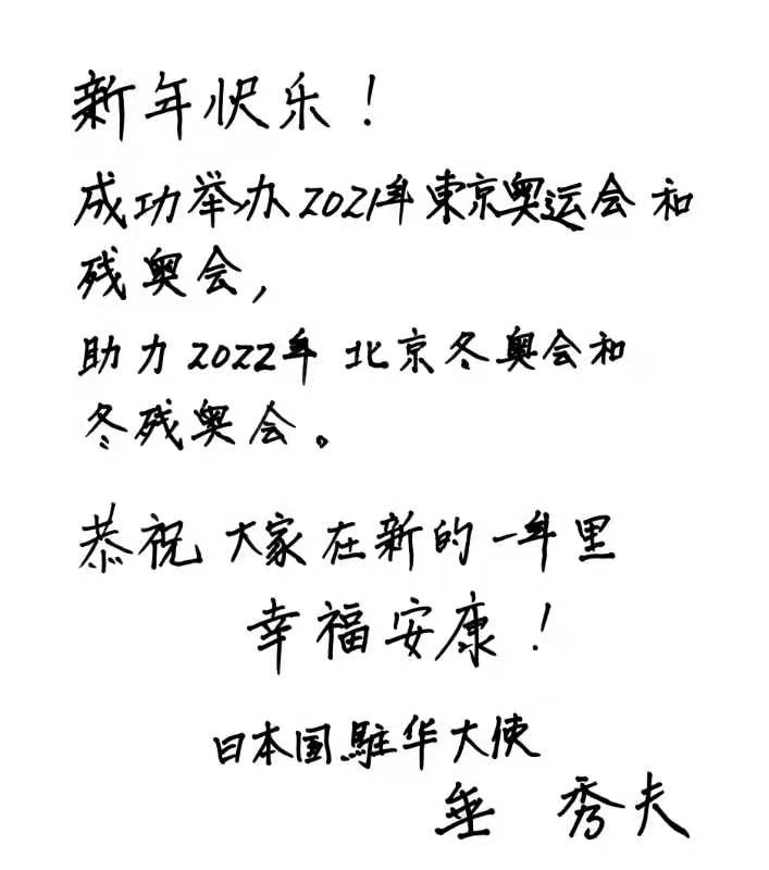 新的一年即将到来,垂秀夫说,在日本有着同中国类似的说法,“一年之计在于元旦”,意思是为了让来年过得精彩,要在辞旧迎新的元旦制定好新一年的计划。“2020年,曾是包括日本和中国在内的全世界饱受新冠疫情之苦的一年。我真诚地祈愿,在新的一年里,全世界并肩携手,早日战胜新冠,一起迎接美好的明天。”