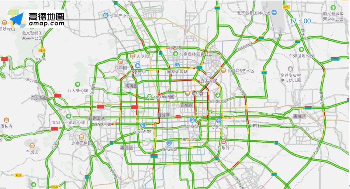 晚高峰时段,东、西部城区的二、三、四环北段南北双向,丰体南路、建外大街、通惠河北路、莲石路、莲石东路等道路出城方向通行压力增大。晚高峰开始的时间预计将提前到16:30,部分道路拥堵的时间也将延长至20:00,周五晚高峰交通压力最为突出。