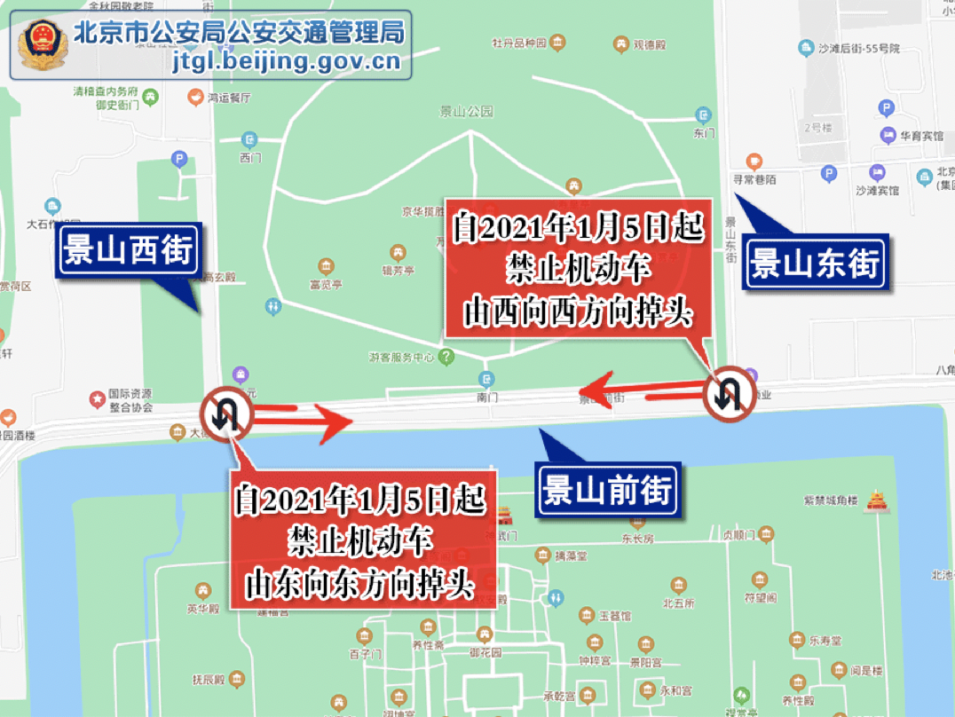 2021年1月5日起,景山前街(景山东街至景山西街段)采取禁止机动车由东向东方向、西向西方向掉头管理措施。