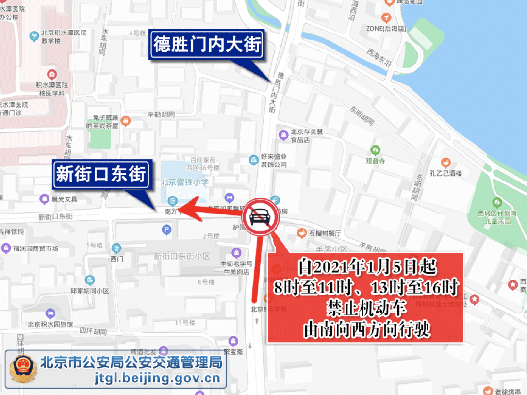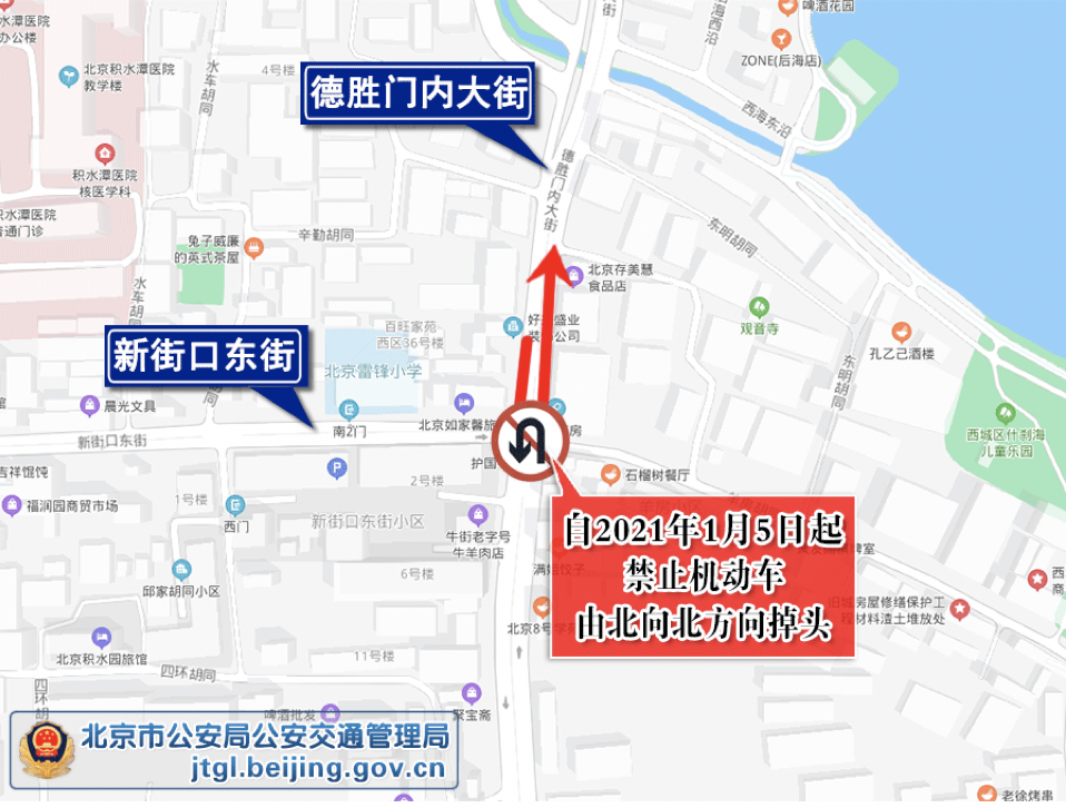 同日起,德胜门内大街与新街口东街交叉口采取以下交通管理措施: